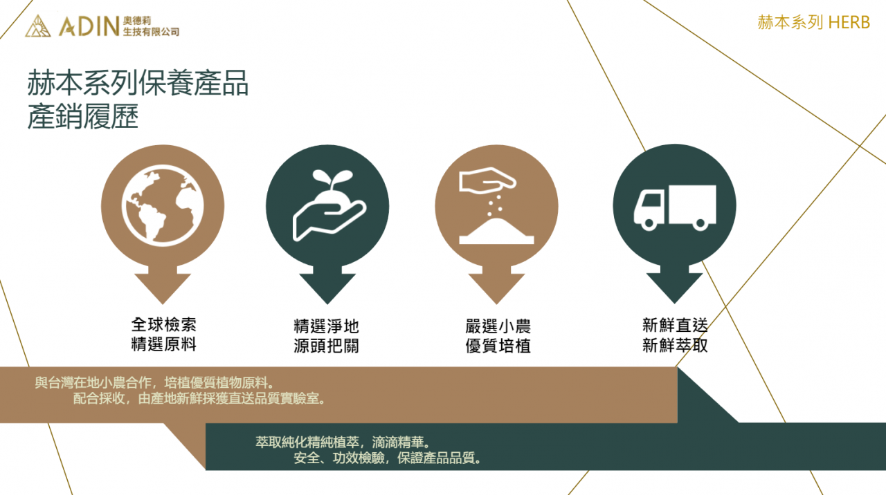 精選篩選每一項原料,特色植萃與與台灣在地小農合作,培植優質植物原料。與學術單位合作,配合農作採收,由產地新鮮採集直送品質實驗室萃取純化。產品的香氛使用源自法國原萃精油。每項產品均由化粧品GMP/ISO廠,MIT製造,並經檢驗合格、功效驗證。