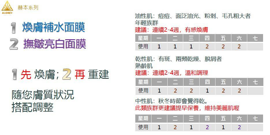 奧德莉公司以1+1>2的加成設計,以先煥膚後重建,先鬆動角質後再加強保濕修護亮白,1)煥膚補水面膜+2)撫皺亮白面膜,依照您的膚質,建議搭配方式,讓您隨時調整,保持肌膚最佳狀態。建議一週至少使用1)+2)組合一次,讓您肌膚煥亮光彩。
