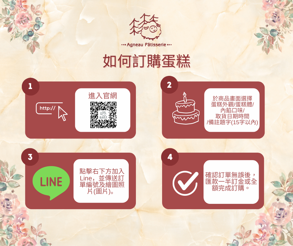 注意事項: 1.每顆蛋糕均附單支小蠟燭,不另附盤叉、刀子,如有需要請另行加購。 2.距取貨日三天內,僅可訂購急單專區蛋糕款式。(14:00後以隔日計算) 3.當日僅可訂購現場款式(請洽LINE官方)。 4.當日若需提前來領蛋糕,請提前3個小時告知!!! 5.無提供草圖繪製的服務!