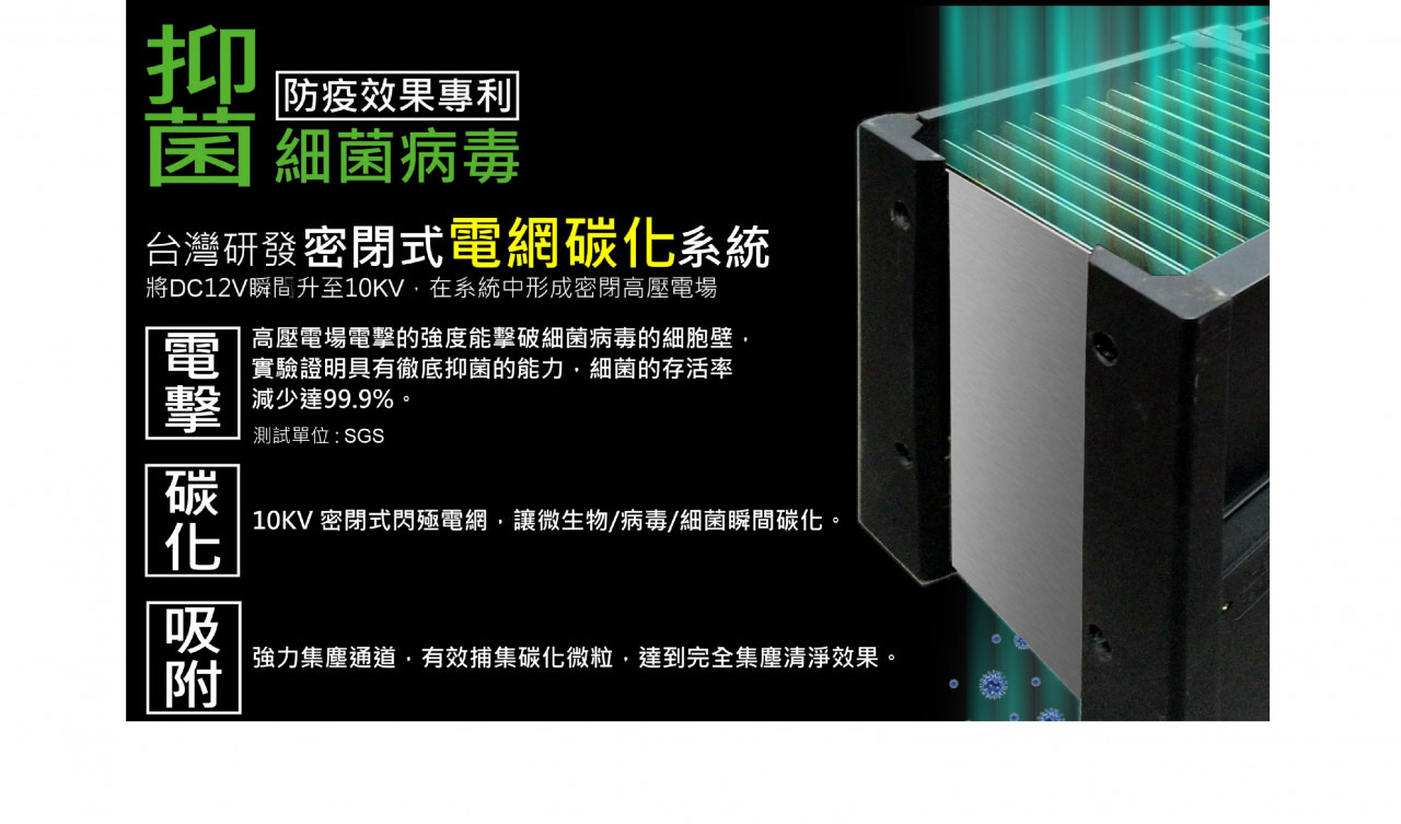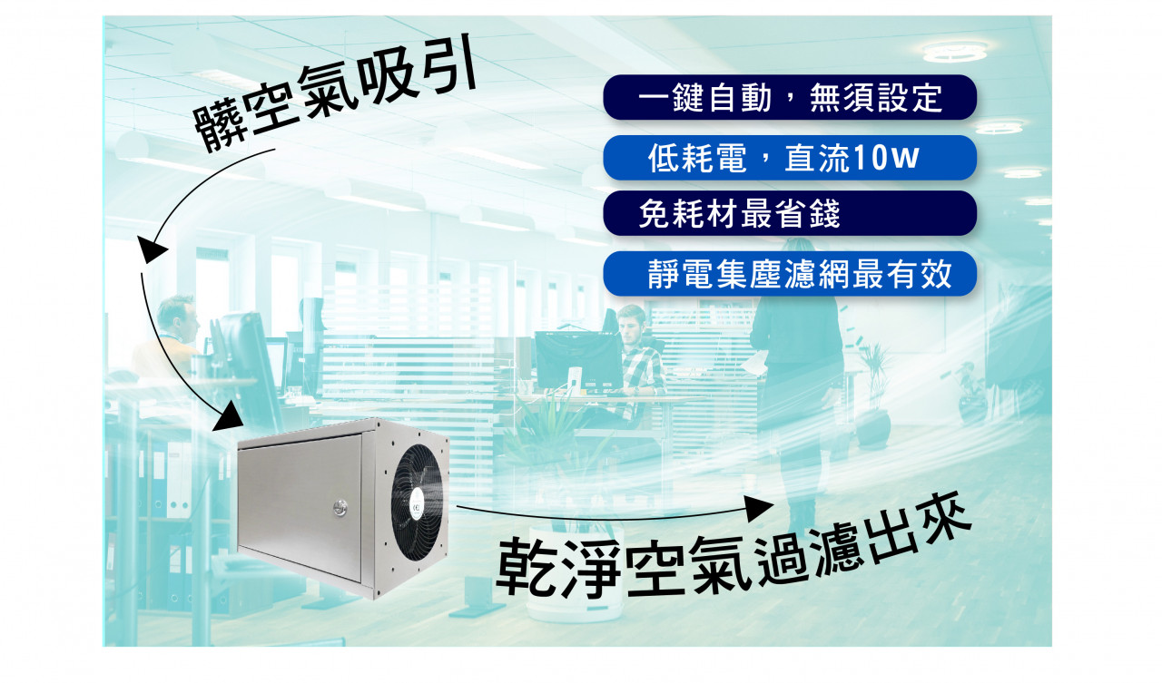 靜電集塵專利技術 所謂「免耗材」的空氣清淨機就是用「靜電集塵吸附髒污」的技術吸附空氣中懸浮粒子,而達到清淨效果,其最大功臣在於機體中的電極線高壓放電產生靜電場,使懸浮粒子帶上正電荷,並利用帶有負電荷的集塵板去做吸附,因此只要清洗集塵板 / 集塵箱就可免換濾網,達到所謂的「免耗材」。市面上機種大部分都是使用需要更換HEPA濾網