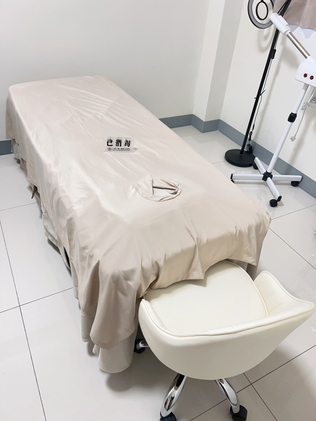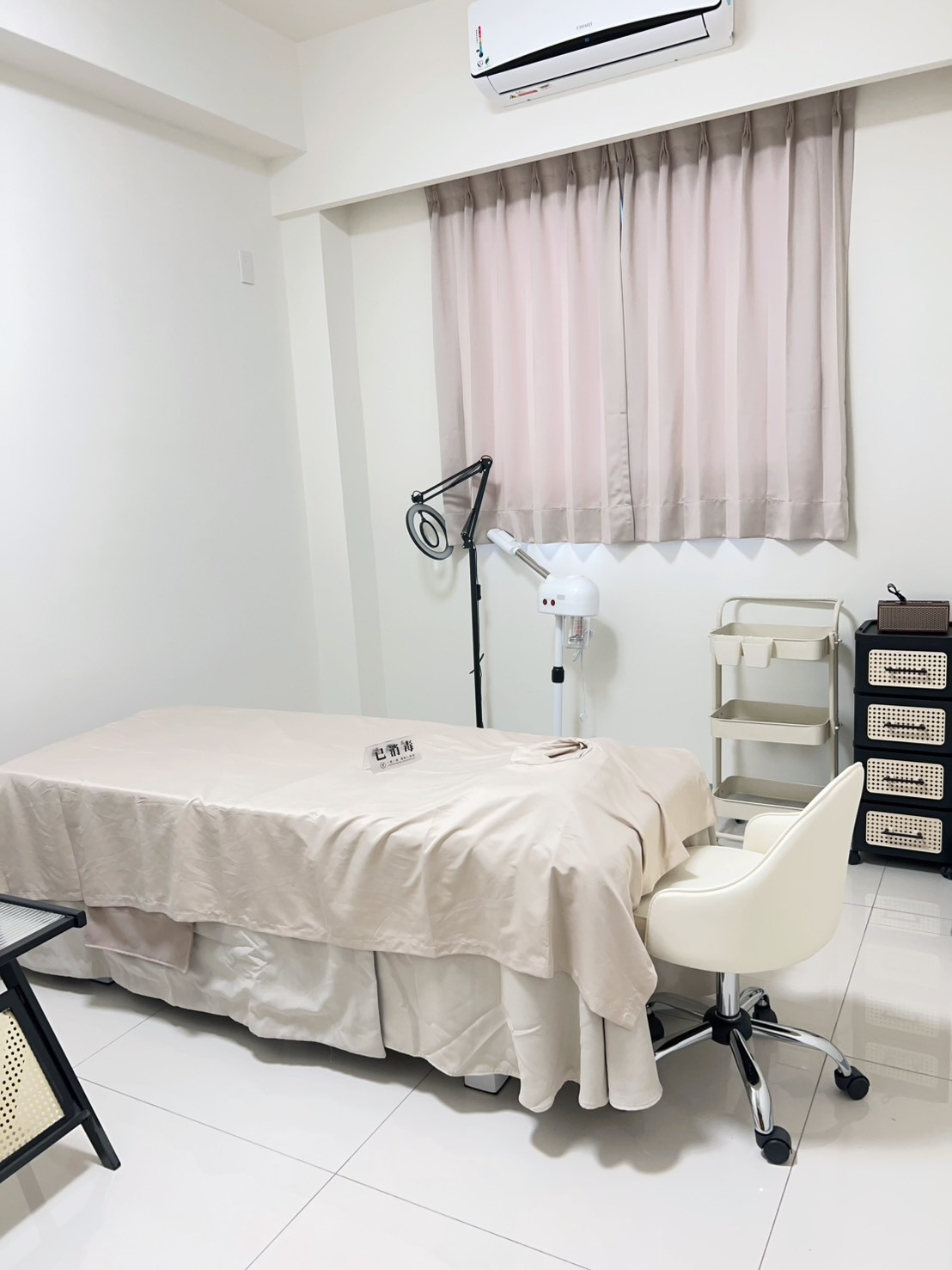 設備:(美容床、美容椅、檯燈、台車、鋪巾、客座小沙發休息區、冷暖氣、置物櫃、提供一次性床單、含WiFi )