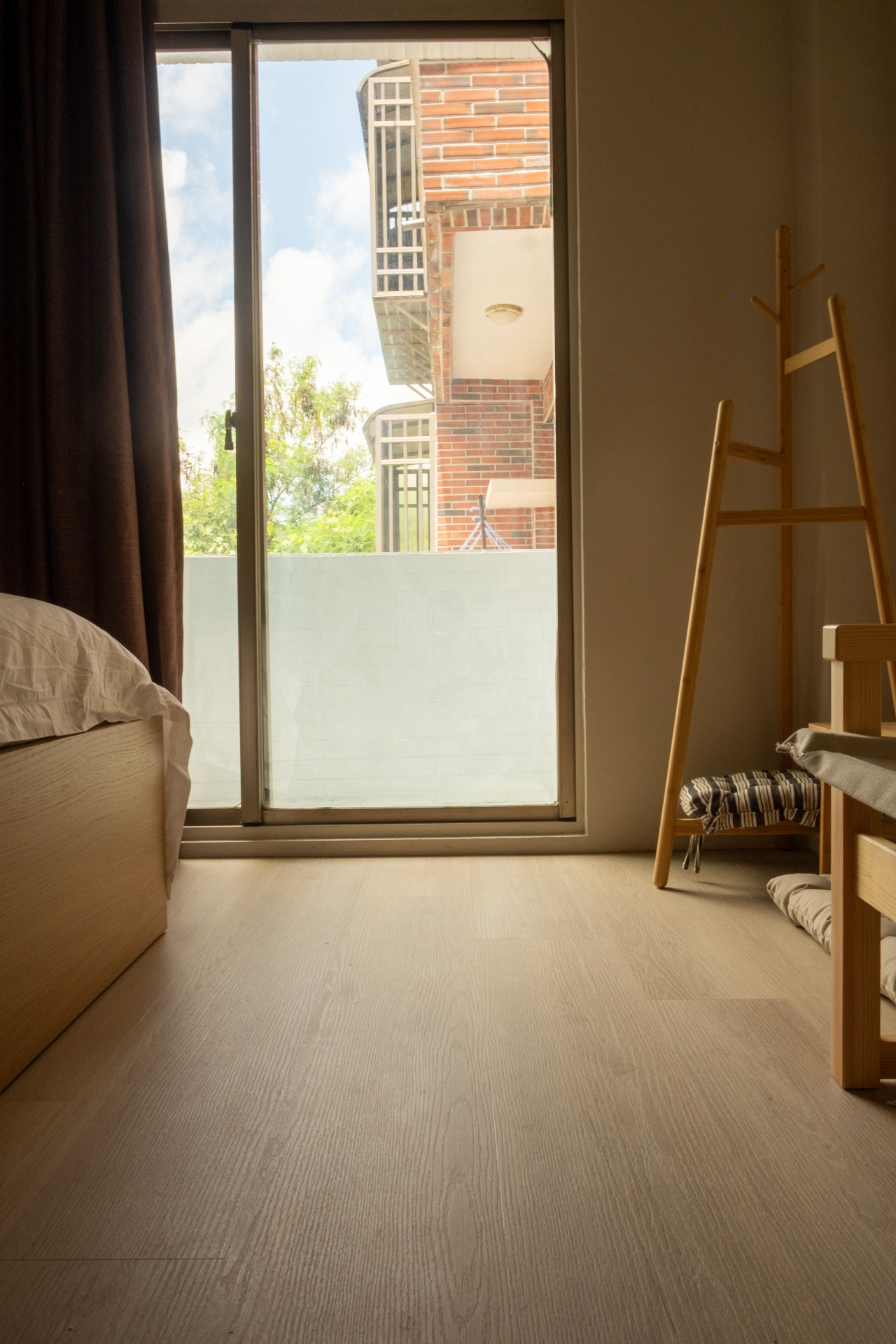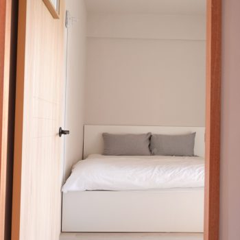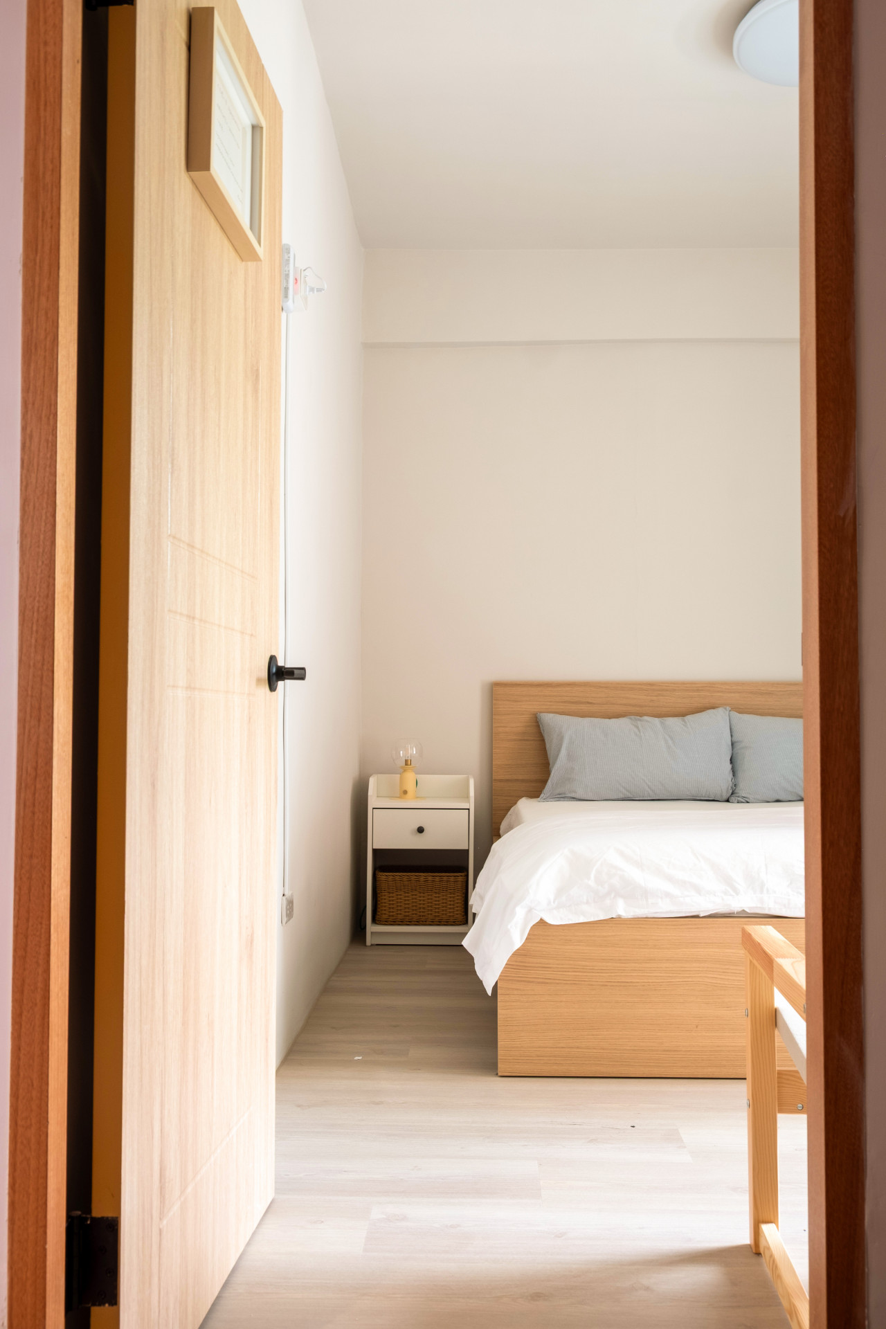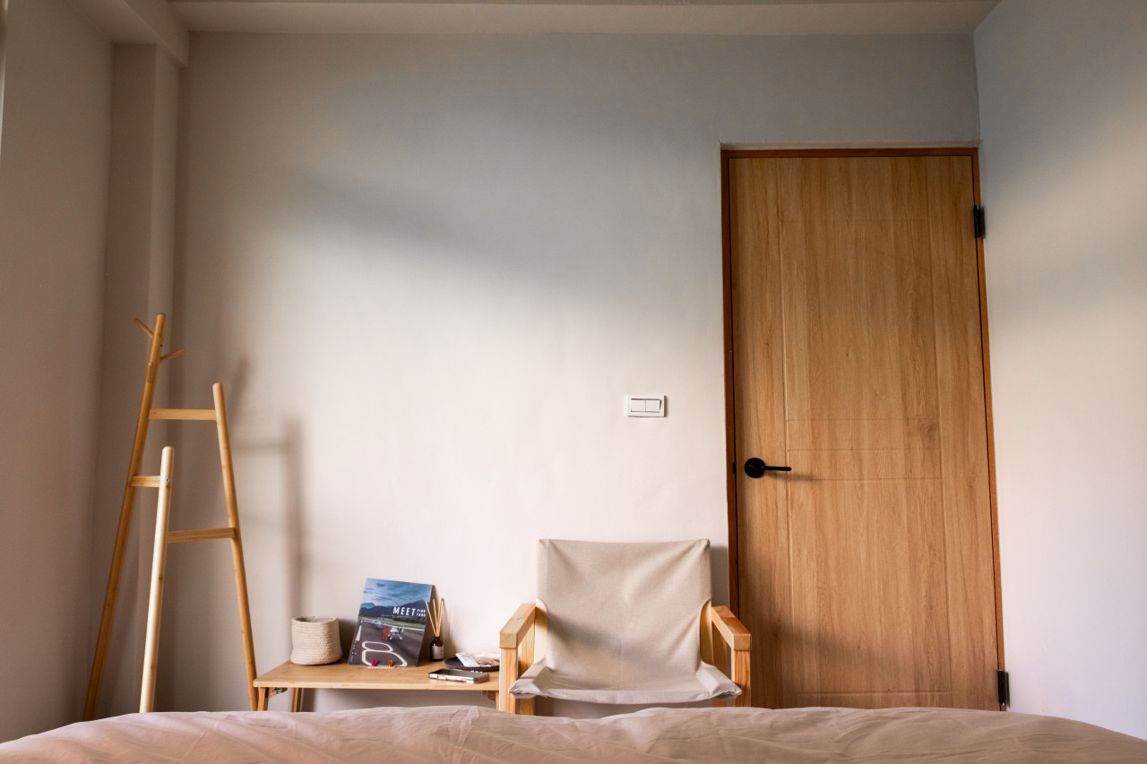 房內配備雙人加大床(150x200cm),純白床單與被套,搭配藍白條紋枕頭,營造如海洋般的清爽氛圍。房內使用溫潤木質家具,空間簡約寧靜,提供舒適自在的休憩環境。