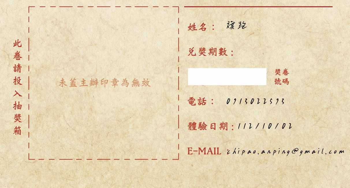 4. 獎券需填寫個人資料,將摸彩聯投入摸獎箱即可參加活動,兌獎時需持存根聯兌獎,遺失視同放棄。