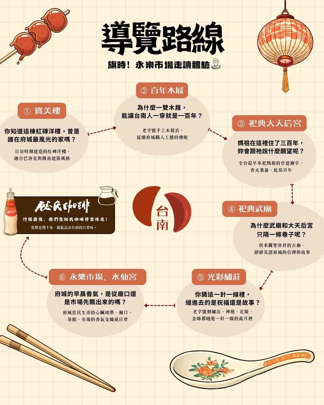 → 寶美樓→ 百年木屐→ 祀典大天后宮→ 祀典武廟→ 光彩繡莊→ 永樂市場與水仙宮