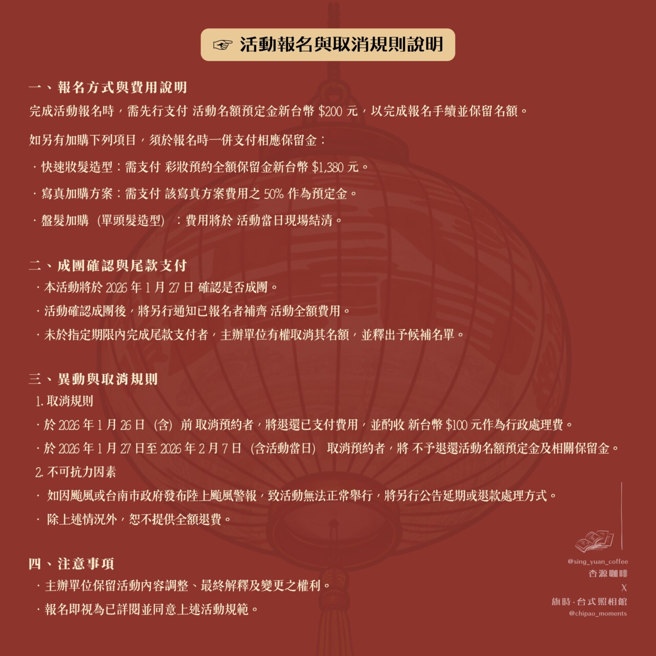 ⚠️活動當日詳細換裝報到時段,將 於1/28 聯繫安排 ⚠️(換裝時段預計為當日8:00-10:30)