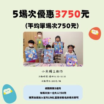 企鵝探險趣 NT$1,250 2 小時 立即預約 佳佳感統派對 NT$950 2 小時 立即預約 寶寶五感塗鴉 NT$700 2 小時 立即預約 小魚獨立創作 NT$800 2 小時 立即預約 平日五場次優惠 NT$3,250 10 小時 立即預約 感統樂園-嫩寶場 NT$700 2 小時 立即預約 感統樂園-小寶場 NT$700 2 小時 立即預約 池塘探險派對 NT$950 2 小時 立即預約 獨立創作五場次 NT$3,750 10 小時 立即預約