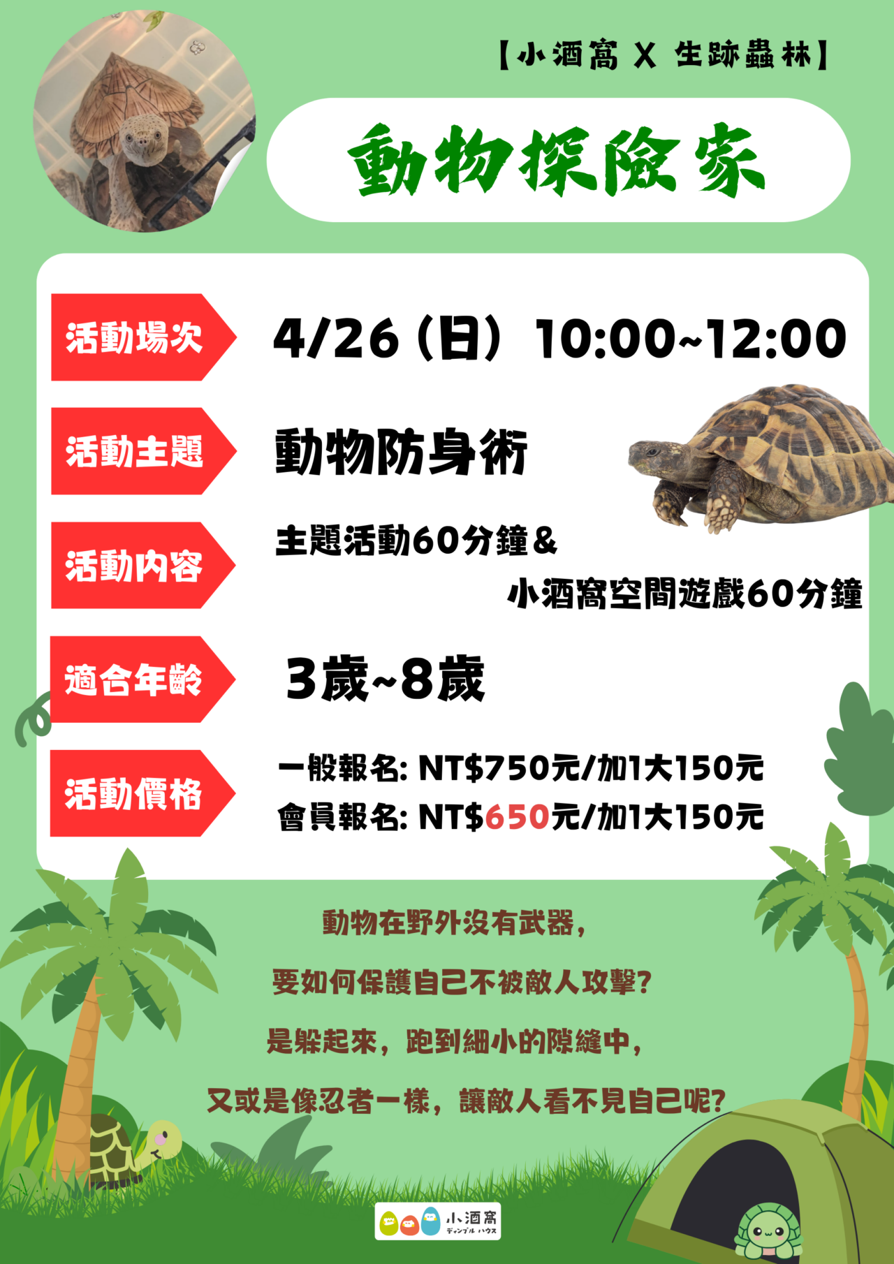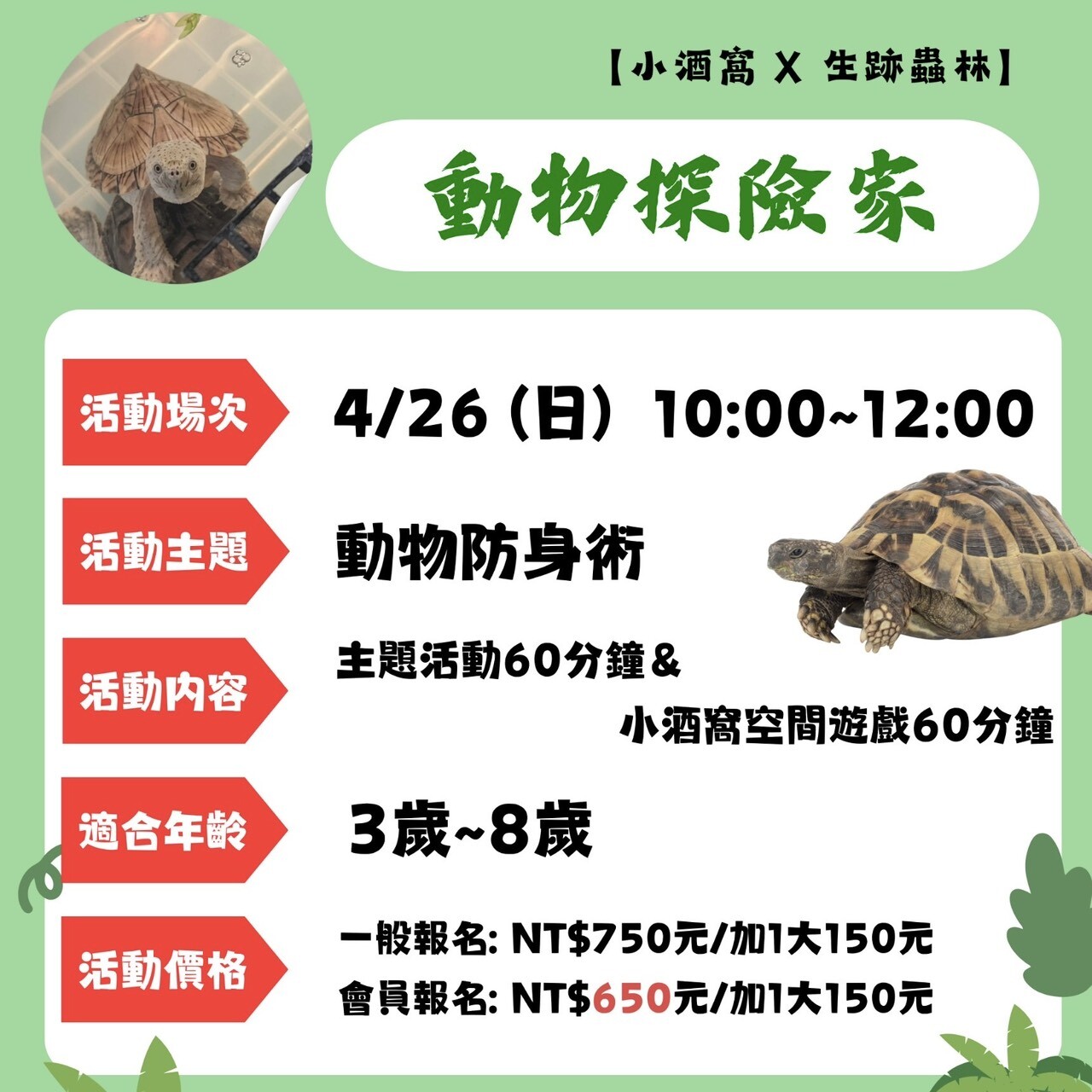 ➤活動日期:4/26 (日) ➤活動場次:Ⓐ場次 10:00-12:00 ➤活動內容:主題活動60分&空間遊戲60分 ➤活動對象:3歲~8歲 ➤滿場組數:8組 ➤會員折扣碼請洽詢LINE小幫手索取