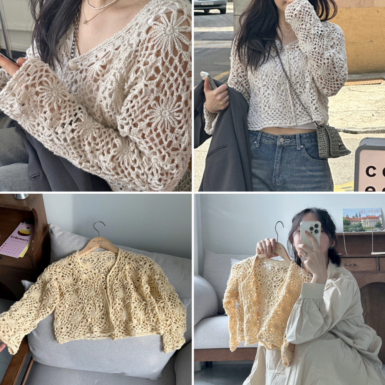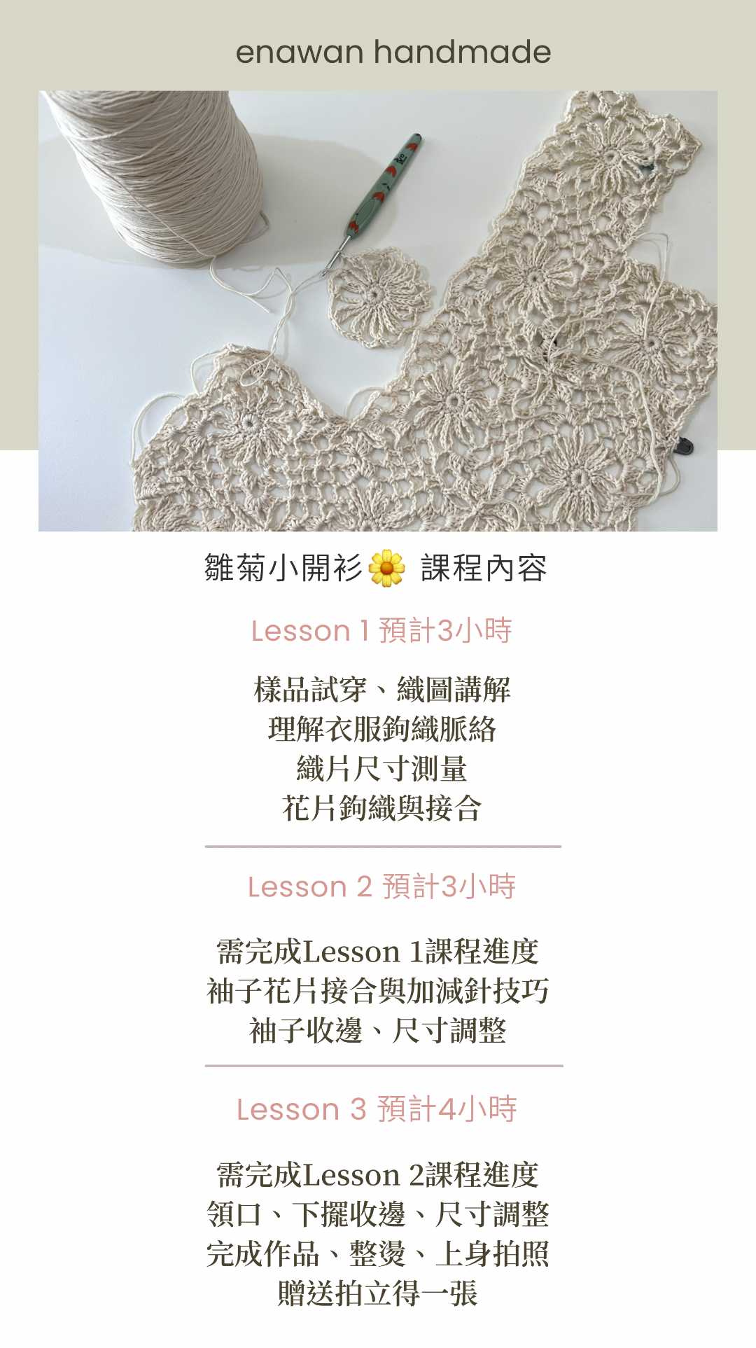 雛菊小開衫亮點:使用韓國製線材、一個花片接合一個花片到收邊技巧,這堂課將帶你一步步完成整件作品,非常適合想親手鉤織第一件罩衫的同學!也很適合當姊妹裝、母女裝,天氣即將轉涼,設計師新增含有羊毛成分的線材供選擇。