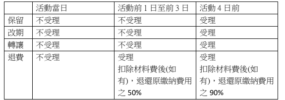 1. 報名後因故未能如期參與者,得按下表申請保留、改期、轉讓,受理與否及退費比例按下表辦理,如報名系列活動,請參見下方第 3 點說明: