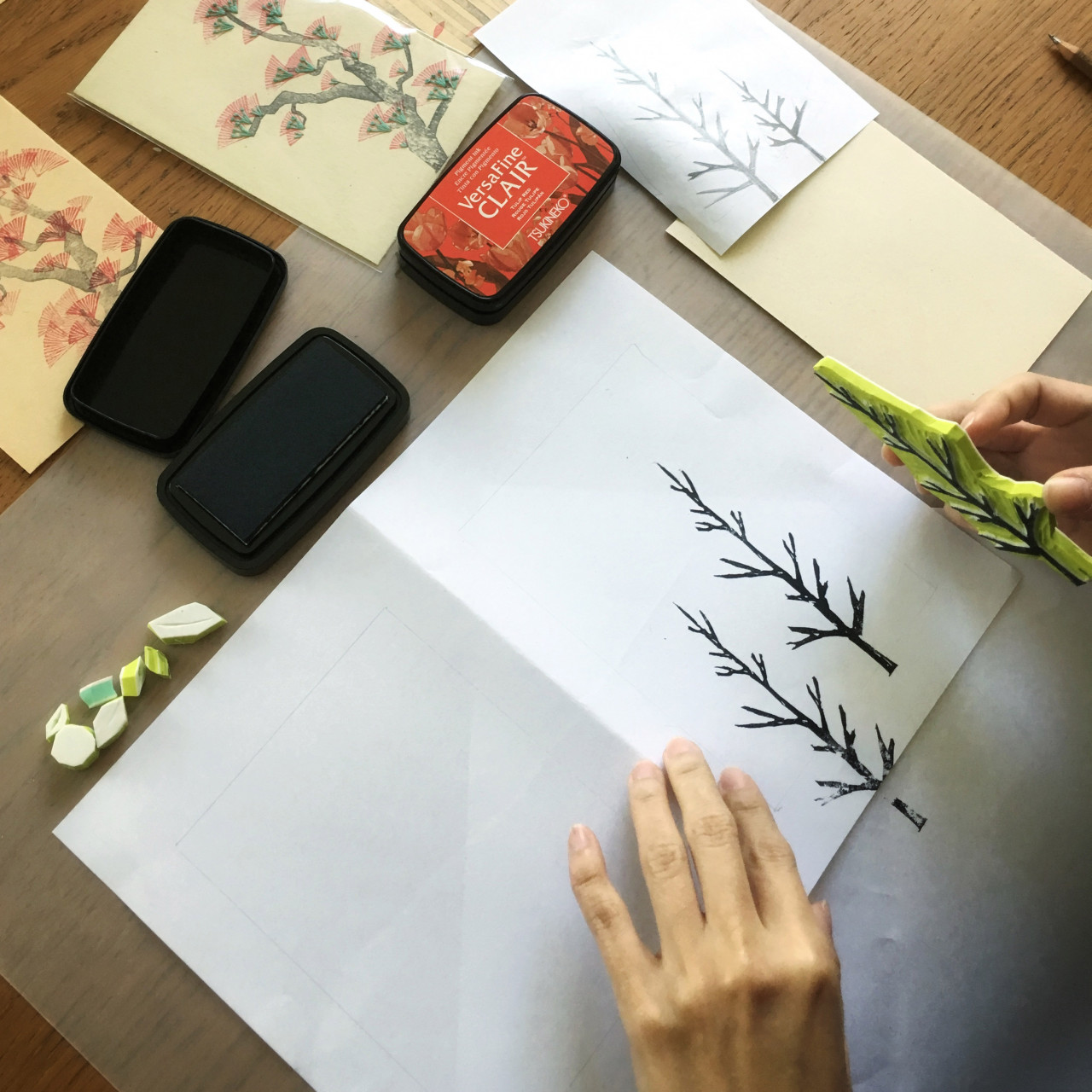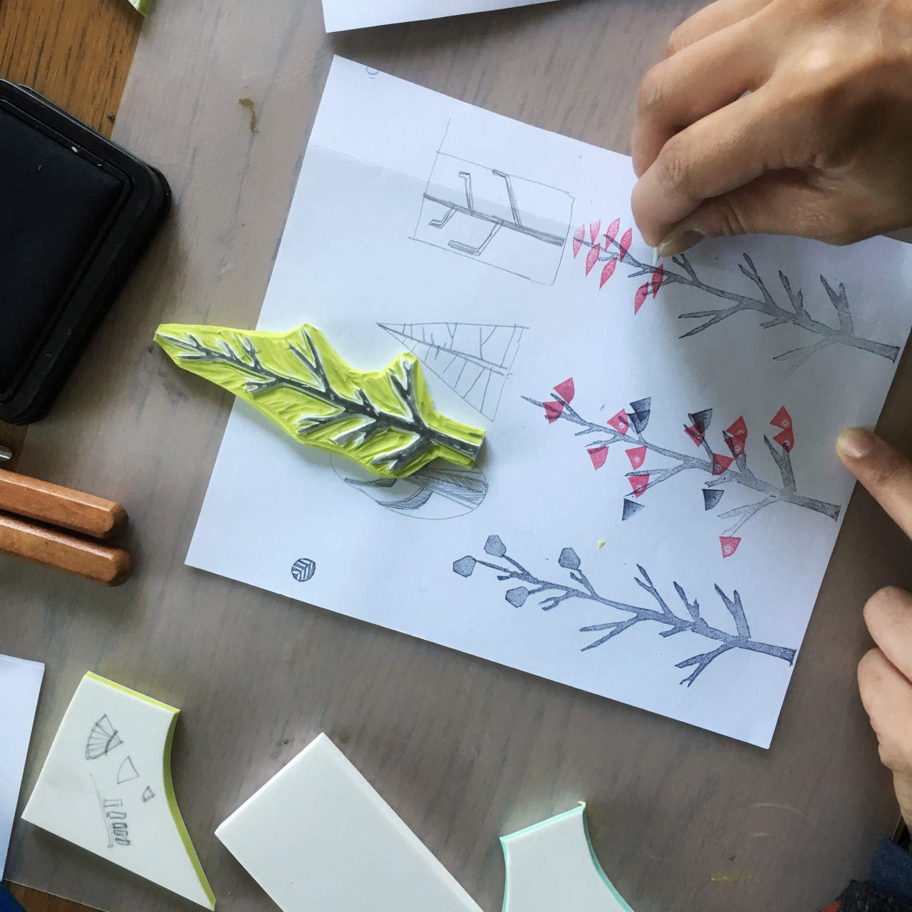 // 創作成品 // 小樹雕刻橡皮章x1組 厚卡明信片x4 A4對圖排版展示作品x1 葉子寫意書籤x1