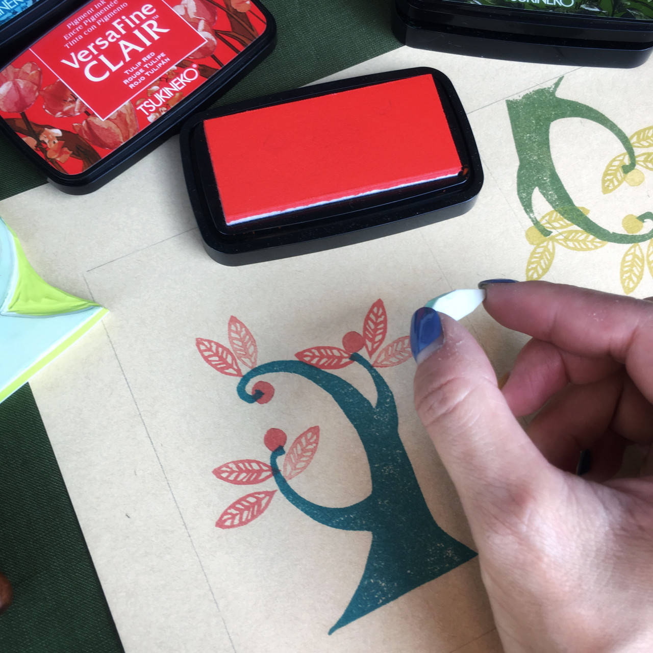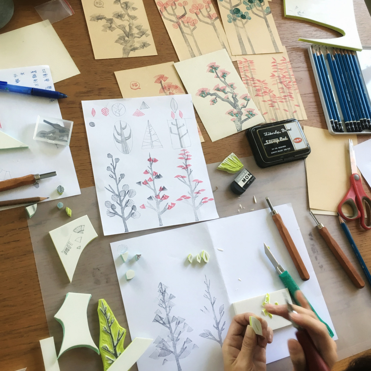 創作>雕刻技法>印染>排版>成品 ・引導如何無基礎創作一棵樹 ・繪製樹身草圖 ・轉印草圖 ・雕刻樹身橡皮章 ・以樹身圖樣為基礎發想葉子 ・雕刻葉子物件橡皮章 ・印染排版 ・成品製作