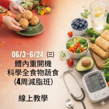 心理急救課程 健檢後延伸課程 園藝治療 特價 《不用節食的穩定瘦》:外食也能執行,4 週打造穩定不復胖的飲食模式 NT$10,000 NT$8,000 加入購物車 特價 《中高階主管健檢後 21 天代謝調整計畫》 外食應酬也能落地,改善三高、慢性發炎與體重管理的高效率飲食策略 NT$20,000 NT$15,000 加入購物車 特價 《體重卡關,其實是代謝失衡》:減重、三高與慢性發炎,其實是同一條線|臨床營養師的1小時實戰飲食課 NT$2,000 NT$1,500 加入購物車 特價 【美食自己來】素食章魚燒 DIY 體驗課|熱烈報名中 NT$799 NT$399 加入購物車 特價 4/29免費~體內大掃除:學會「三高回穩」的抗發炎 SOP NT$3,000 NT$0 加入購物車 特價 5/6免費~體內大掃除:學會「三高回穩」的抗發炎 SOP NT$3,000 NT$0 加入購物車 特價 6/3~6/24 體內重開機,科學全食物蔬食4周減脂班 NT$5,500 NT$4,000 加入購物車 特價 啡嚐療癒: 咖啡 × 多肉 DIY 午後時光 NT$999 NT$399 加入購物車 特價 園藝治療 NT$999 NT$799 2 小時 立即預約 特價 體內重開機,科學全食物蔬食4周減脂班 NT$5,500 NT$4,000 加入購物車 特價 啡嚐療癒: 咖啡 × 多肉 DIY 午後時光 NT$999 NT$399 加入購物車 特價 園藝治療 NT$999 NT$799 2 小時 立即預約