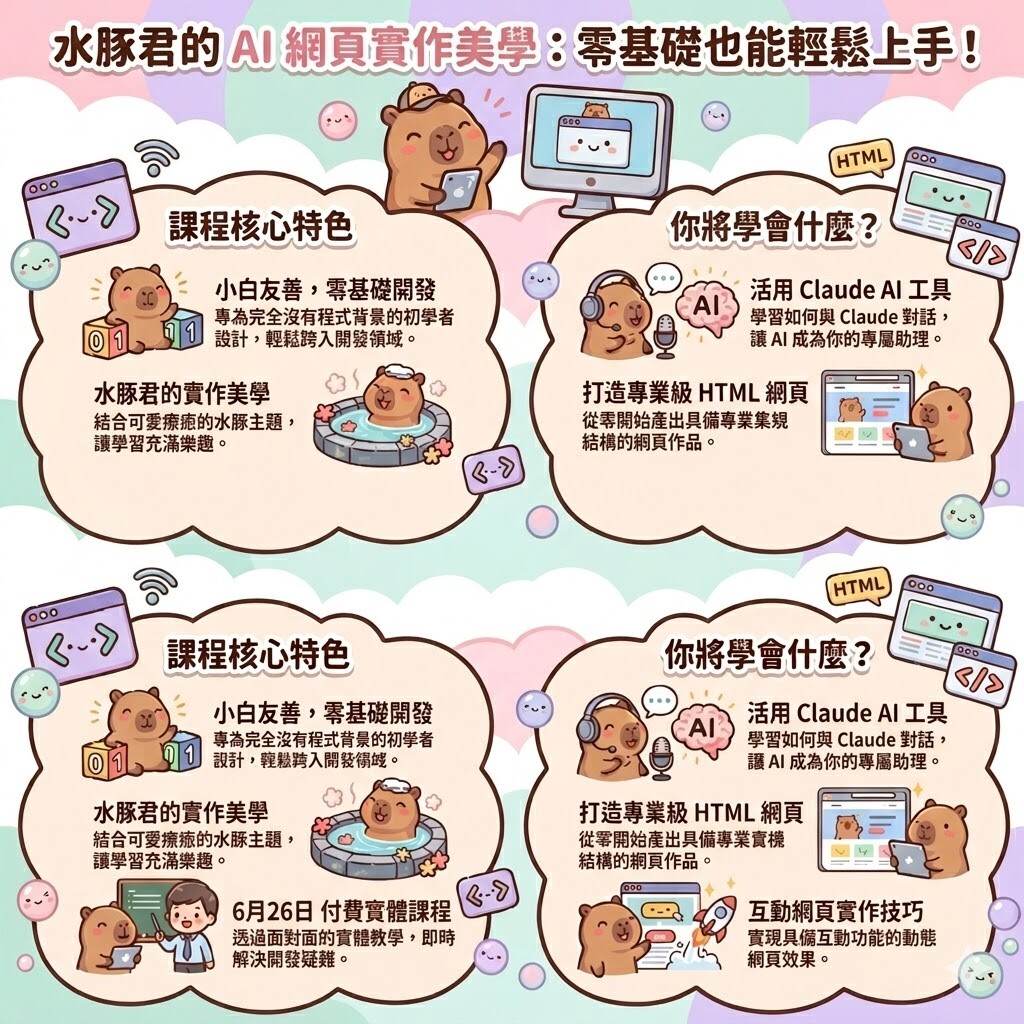 最後,水豚君想對你說: AI 的世界變化很快,但這不代表你必須活在急躁中。 重要的不是你現在懂多少,而是你是否願意推開那扇窗。 不需要完美的準備,也不需要覺得自己「還不夠好」, 加入我們,一起開始就對了。 讓我們一起,慢慢來,但一直前進! 💪
