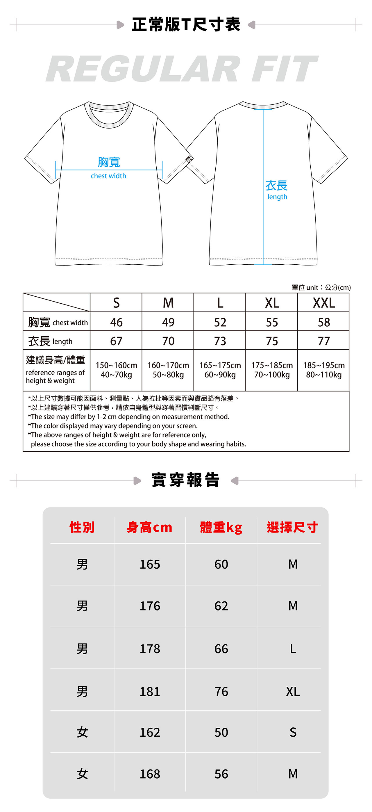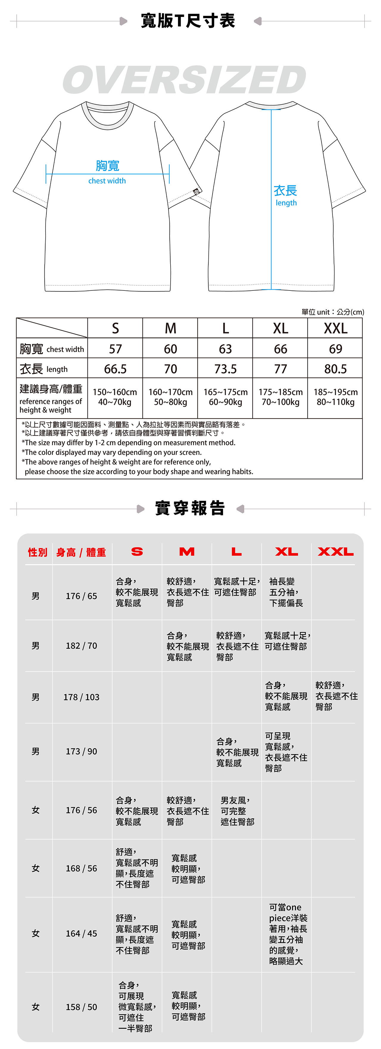 首先,先決定自己想穿『寬版』or『合身版』,接著可以參考我們上述的實穿報告,若沒有您可以參考的範例,可先自行丈量手邊適合的T恤,再比照尺寸表。若家中沒有皮尺可丈量,可至STAGE Instagram私訊詢問。
