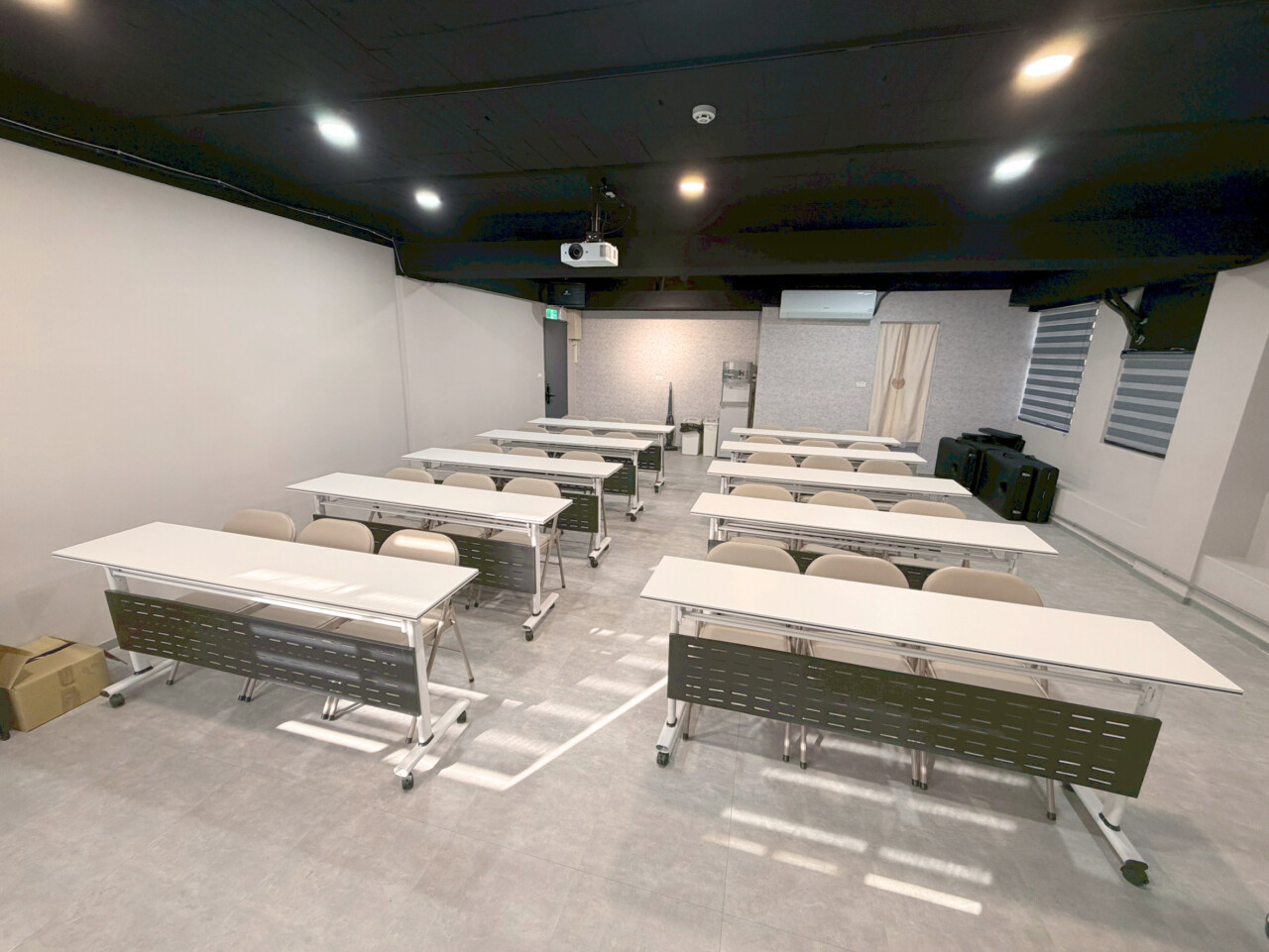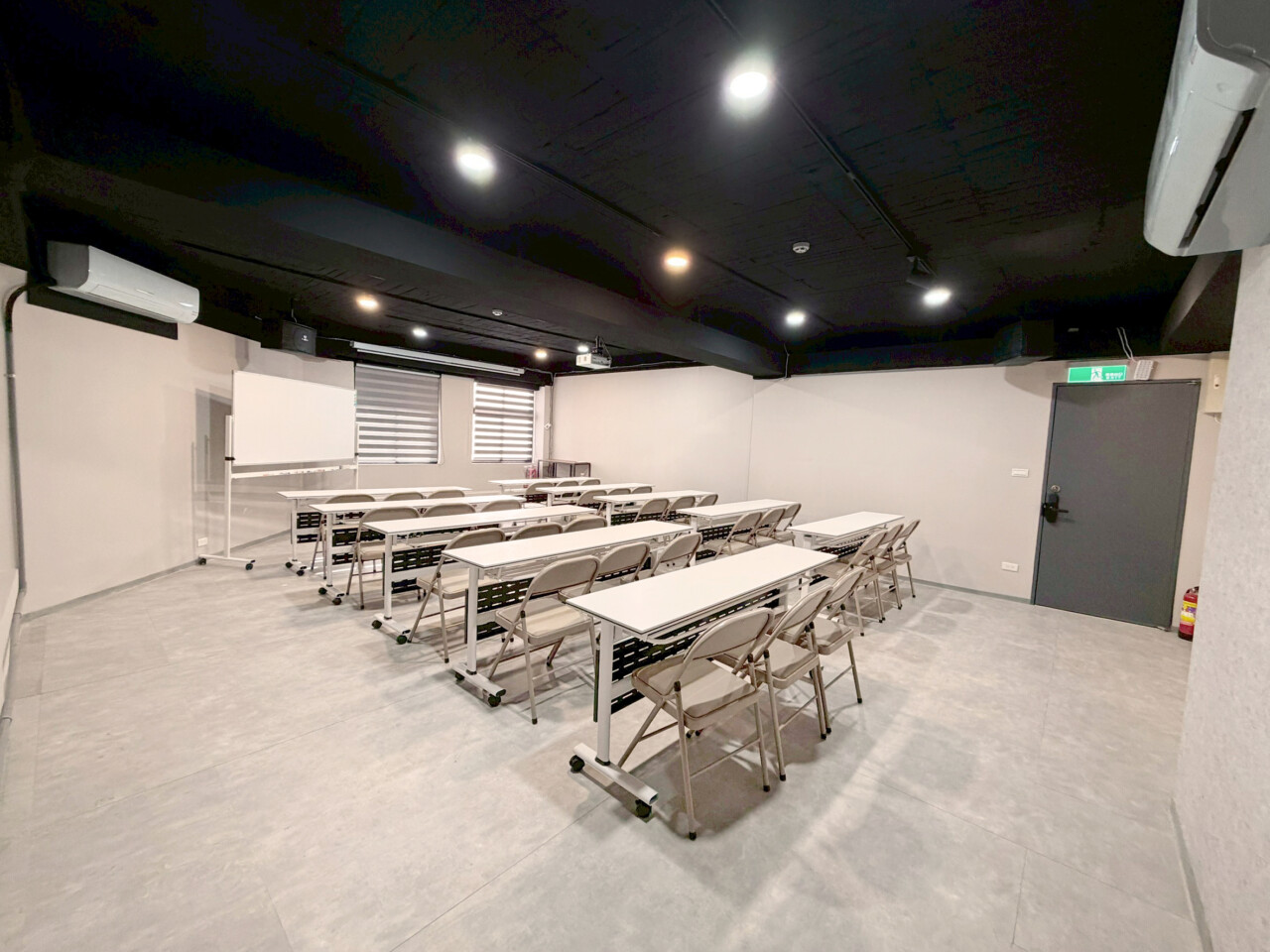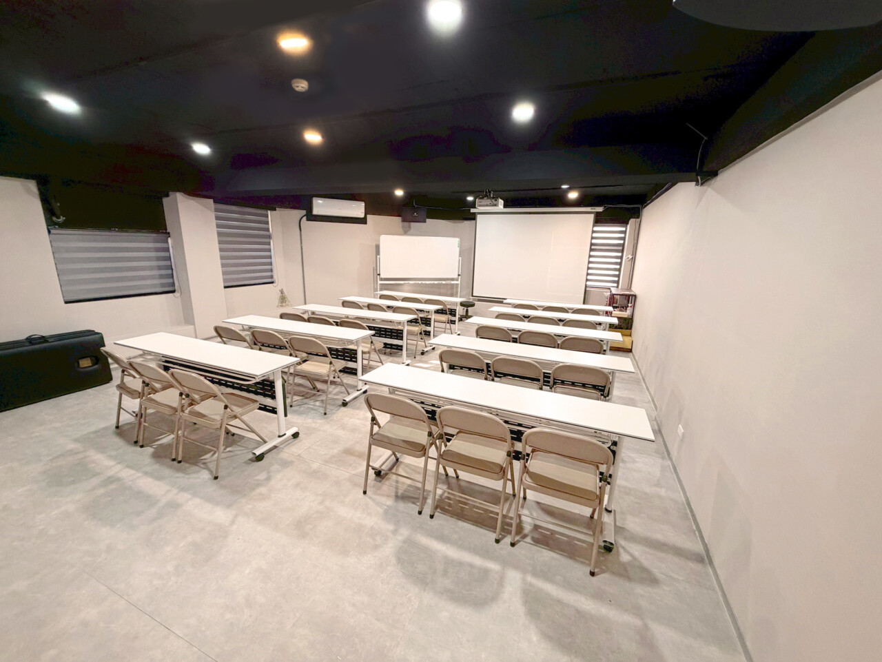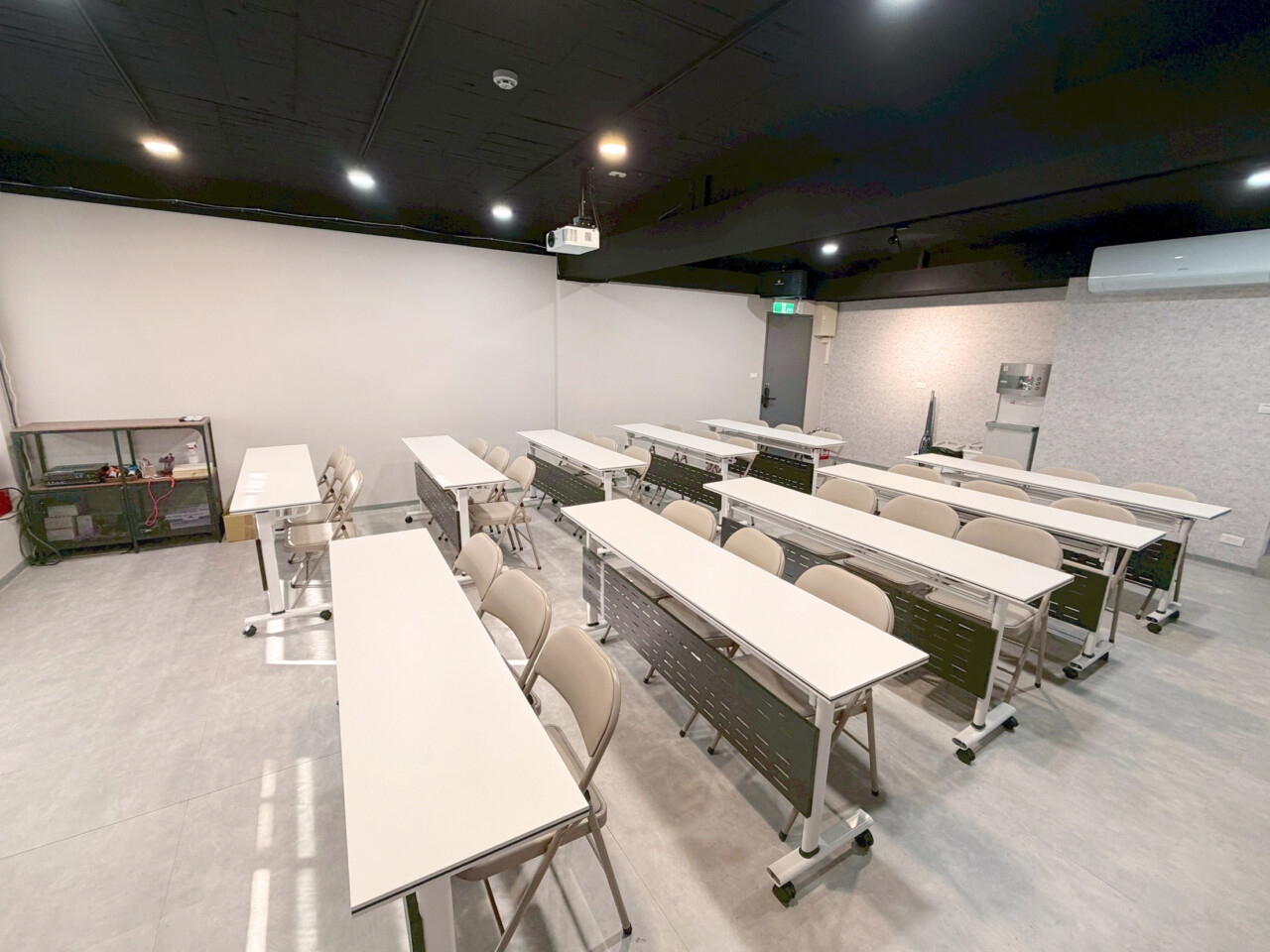 空間整潔明亮,現場備有120吋投影布幕,清晰大畫面適合講解與視覺輔助,課程或簡報皆可靈活使用。提供安靜舒適的教學氛圍。場地內另備有遙控設備、補光燈、桌燈等貼心備品,實用又便利。