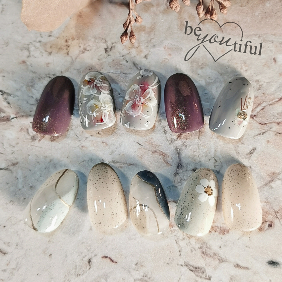 實務沙龍〈日系花卉〉 精緻的美甲設計 上排以深紫與灰色為主調,搭配立體花卉與細緻線條,展現優雅高貴的氣質;下排則以米白與灰金色系為主,融合自然石紋與小花設計,呈現柔和典雅的風格。整體風格兼具藝術感與時尚感,適合各種場合配戴。