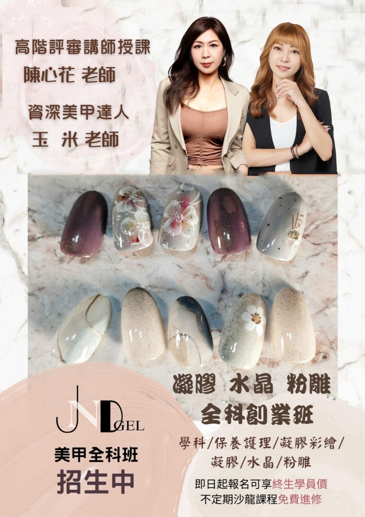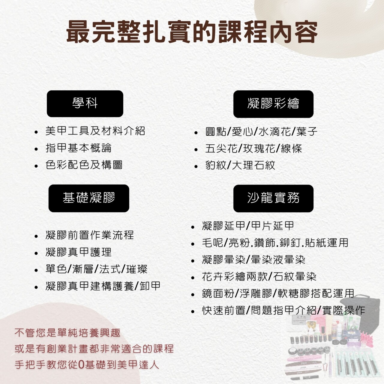 課程特色 本課程專為想進入美甲產業或提升專業技術的學員設計,從基礎指甲保養到進階藝術設計,完整培養專業美甲師技能。 .精緻小班制教學 .一年內可免費重修 .報名享終身學員價 .不定期沙龍課程免費進修 .送整套美甲工具材料及TNA國家丙級檢定課 .頒發結業證書