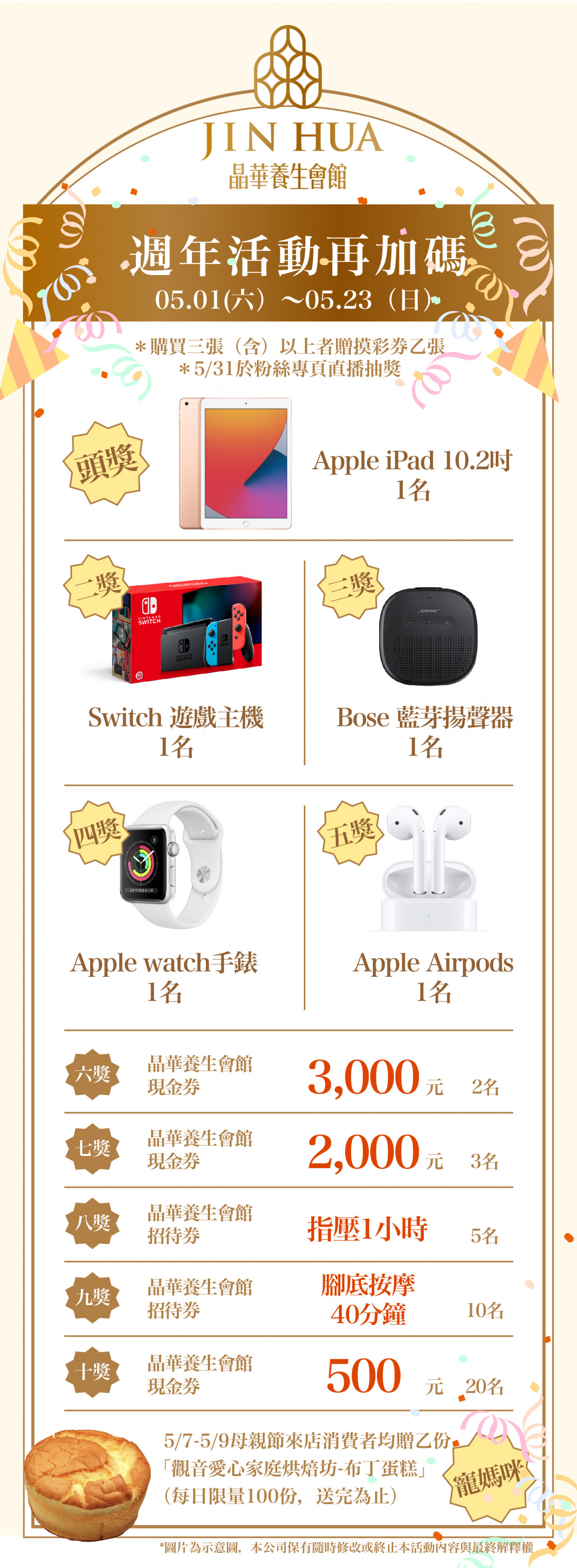 付款方式 可使用信用卡、ATM、超商代碼及超商條碼結帳 配送方法 完成付款2~5個工作天以郵寄掛號方式完成出貨,並隨貨附發票及抽獎券 活動期間全館免運,宅配範圍限台灣本島,離島暫不做寄送 經銷商 晶華瘦身美妍社 電話:(03)357-9199 退換貨方式 購買週年慶活動票券日期為2021.05.01至2021.05.23, 於週年慶結束後,仍可使用此項活動票券。 晶華養生會館所提供週年慶活動、線上活動及活動促銷等方案,若消費者接收之票券無損,本公司無法提供退貨服務。 本公司活動票券皆為確認完整無誤後寄出,若消費者所接收之票券有毀損、疏漏、不可辨識等不可歸責於雙方事項,本公司將以退換貨方式處理。請私訊FB粉絲專頁『晶華養生會館』,提供訂購人姓名及電話,並告知票券毀損相關訊息,工作人員將為您安排後續換貨/退貨流程,實際到貨日需以物流公司為準。 下訂結帳成功後,本票券將於隔日以郵寄掛號方式寄出,物流時間約2~5日,完成訂購後,請務必留意陌生電話及訊息。若超過7日未成功收貨,請私訊FB粉絲專頁『晶華養生會館』,提供訂購人姓名、電話及地址,後續將由工作人員幫您做確認。