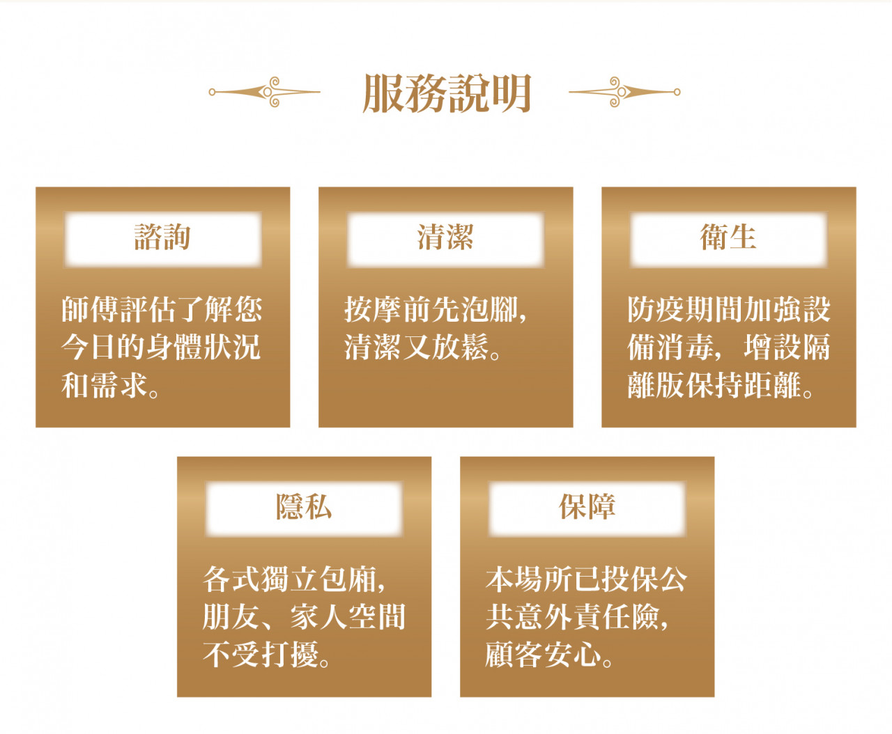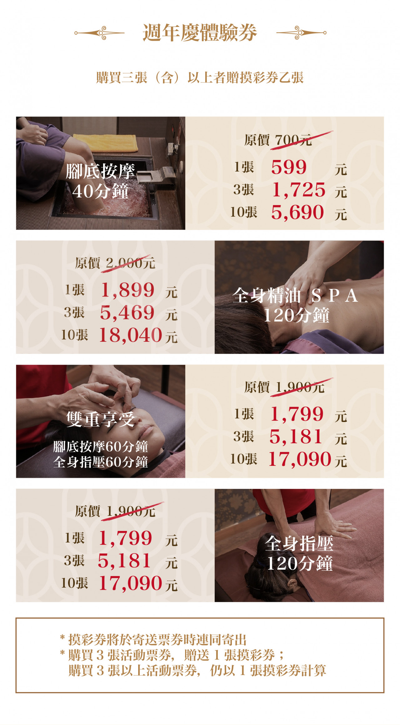 特價 腳底按摩40分鐘 NT$799 NT$599 限量 21 組加入購物車 特價 腳底按摩40分鐘/3張(贈抽獎券乙張) NT$1,797 NT$1,725 限量 12 組加入購物車 特價 腳底按摩40分鐘/10張(贈抽獎券乙張) NT$5,990 NT$5,690 限量 5 組加入購物車 特價 全身精油SPA120分鐘 NT$2,000 NT$1,899 限量 26 組加入購物車 特價 全身精油SPA120分鐘/3張(贈抽獎券乙張) NT$6,000 NT$5,469 限量 15 組加入購物車 特價 全身精油SPA120分鐘/10張(贈抽獎券乙張) NT$20,000 NT$18,040 限量 7 組加入購物車 特價 雙重享受120分鐘 NT$1,900 NT$1,799 限量 26 組加入購物車 特價 雙重享受120分鐘 /3張(贈抽獎券乙張) NT$5,700 NT$5,181 限量 14 組加入購物車 特價 雙重享受120分鐘/10張(贈抽獎券乙張) NT$19,000 NT$17,090 限量 6 組加入購物車 特價 全身指壓120分鐘 NT$1,900 NT$1,799 限量 28 組加入購物車 特價 全身指壓120分鐘 /3張(贈抽獎券乙張) NT$5,700 NT$5,181 限量 13 組加入購物車 特價 全身指壓120分鐘 /10張(贈抽獎券乙張) NT$19,000 NT$17,090 限量 7 組加入購物車