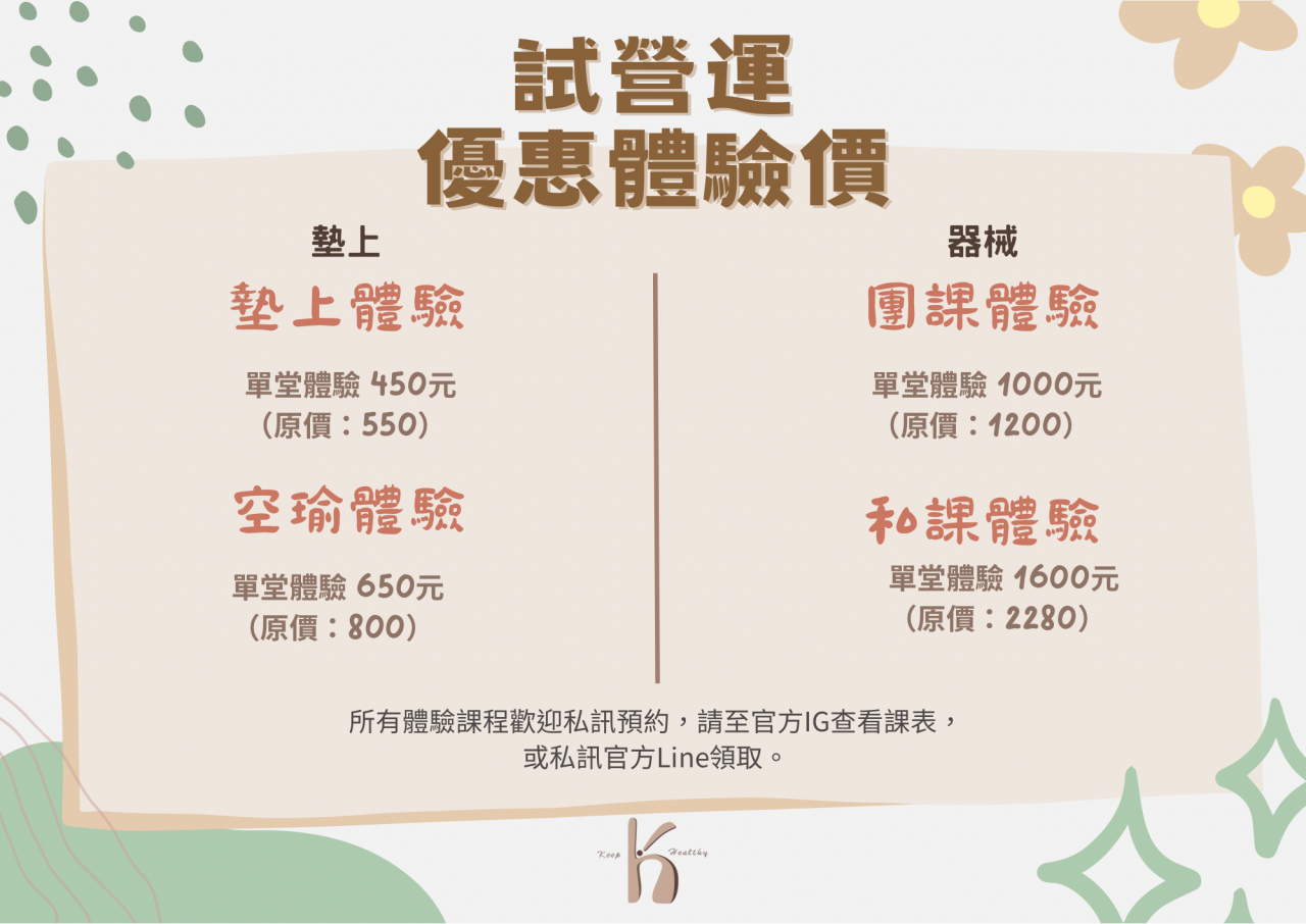常態課程預約 ______ 伸展瑜珈 NT$550 1 小時 立即預約 器械團課 NT$1,200 1 小時 立即預約 成人街舞 NT$550 1 小時 立即預約 舞動燃脂-Zumba NT$550 1 小時 立即預約 輔具皮拉提斯 NT$550 1 小時 立即預約 間歇燃脂 NT$550 1 小時 立即預約