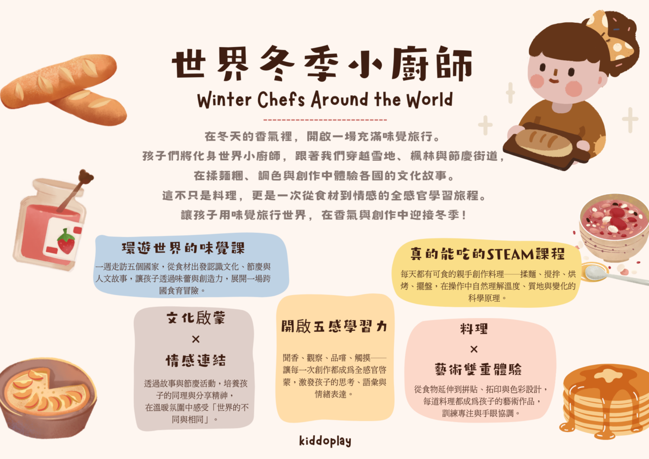 孩子們將化身世界小廚師,跟著我們穿越雪地、楓林與節慶街道,在揉麵糰、調色與創作中體驗各國的文化故事。