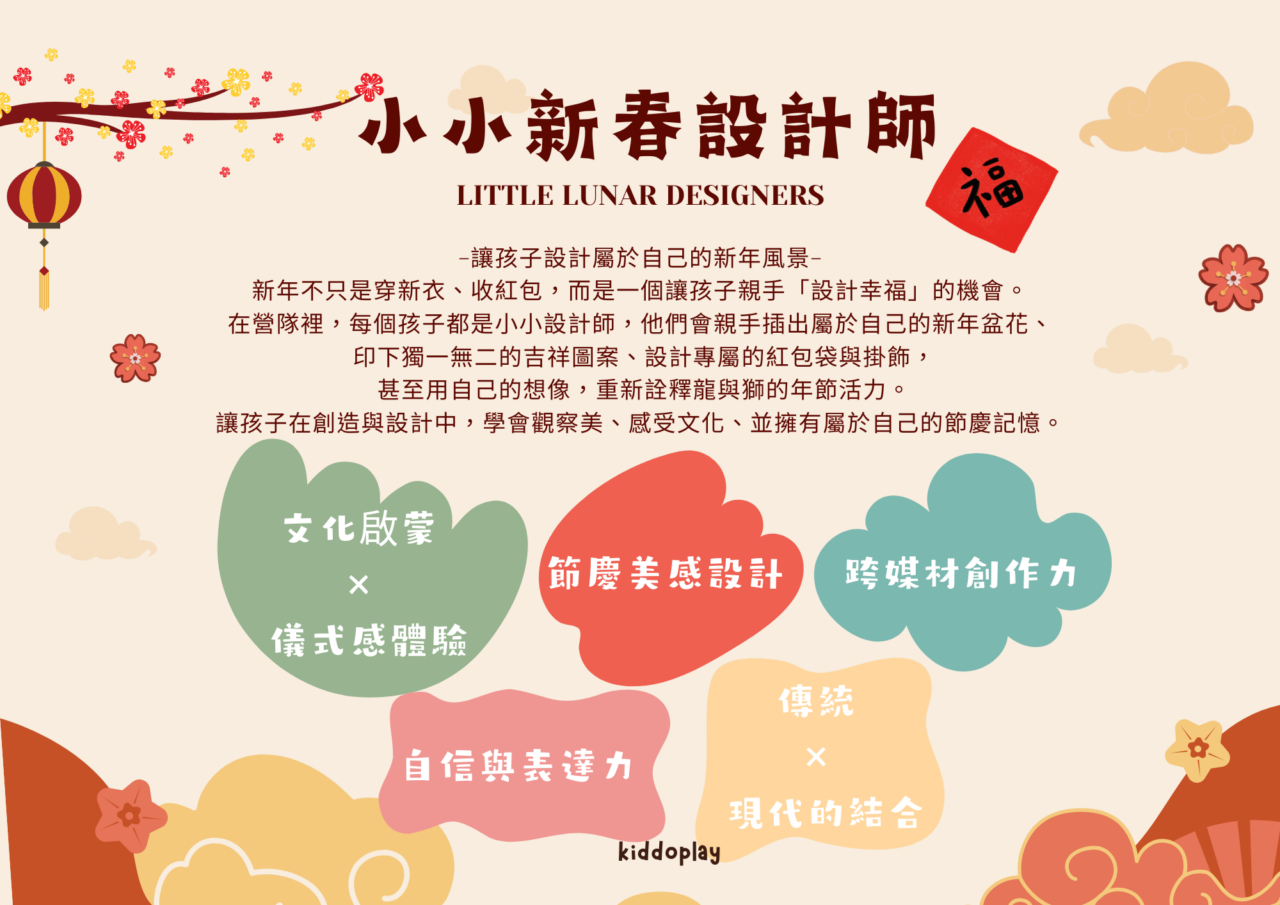 在營隊裡,每個孩子都是小小設計師,他們會親手插出屬於自己的新年盆花、印下獨一無二的吉祥圖案、設計專屬的紅包袋與掛飾,甚至用自己的想像,重新詮釋龍與獅的年節活力。