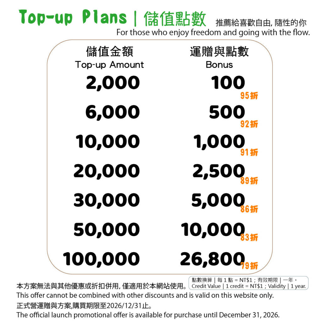 所有儲值點數需於購買日起 一年內使用完畢,
