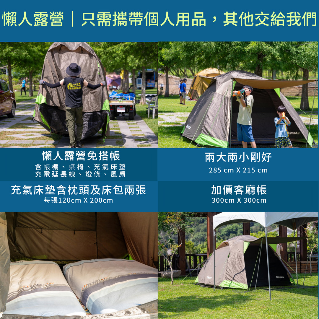 懶人搭帳只有一個簡易的小前庭,下大雨需要避到帳棚內,會加價租借客廳帳喔
