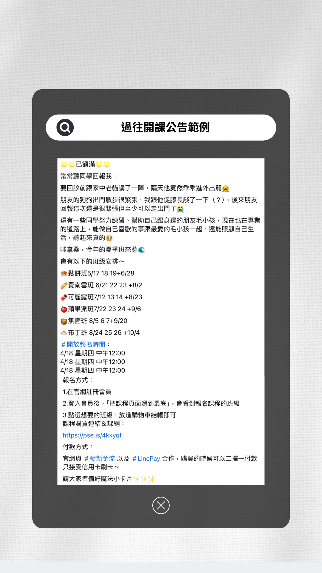 除了精實的課程練習與授課,還有長達6週的大量動物溝通練習,有任何疑問、卡關,都能詢問Leslie本人,獲得Leslie的個別指導。(課後社團發問或電子郵件方式)