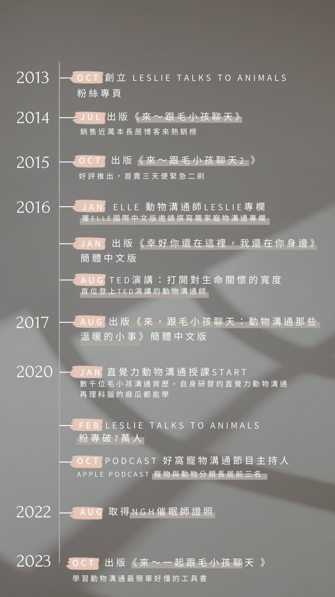 Leslie also shares and documents her communication stories with animals on blog and Facebook. She's currently a columnist for ELLE.com and UDN News. Through her writing, Leslie takes readers to look at animals with a whole new fresh perspective.