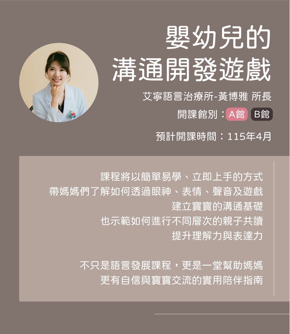 課程將以簡單易學、立即上手的方式,帶媽媽們了解如何透過眼神、表情、聲音及遊戲,建立寶寶的溝通基礎,也示範如何進行不同層次的親子共讀,提升理解力與表達力。不只是語言發展課程,更是一堂幫助媽媽更有自信與寶寶交流的實用陪伴指南!