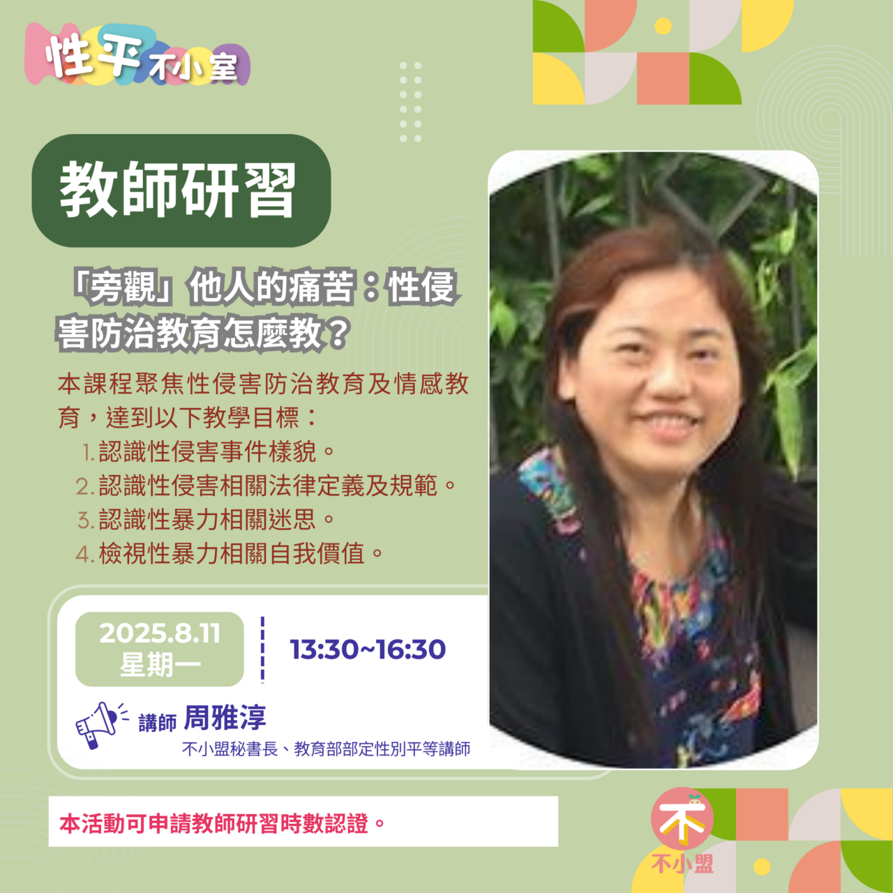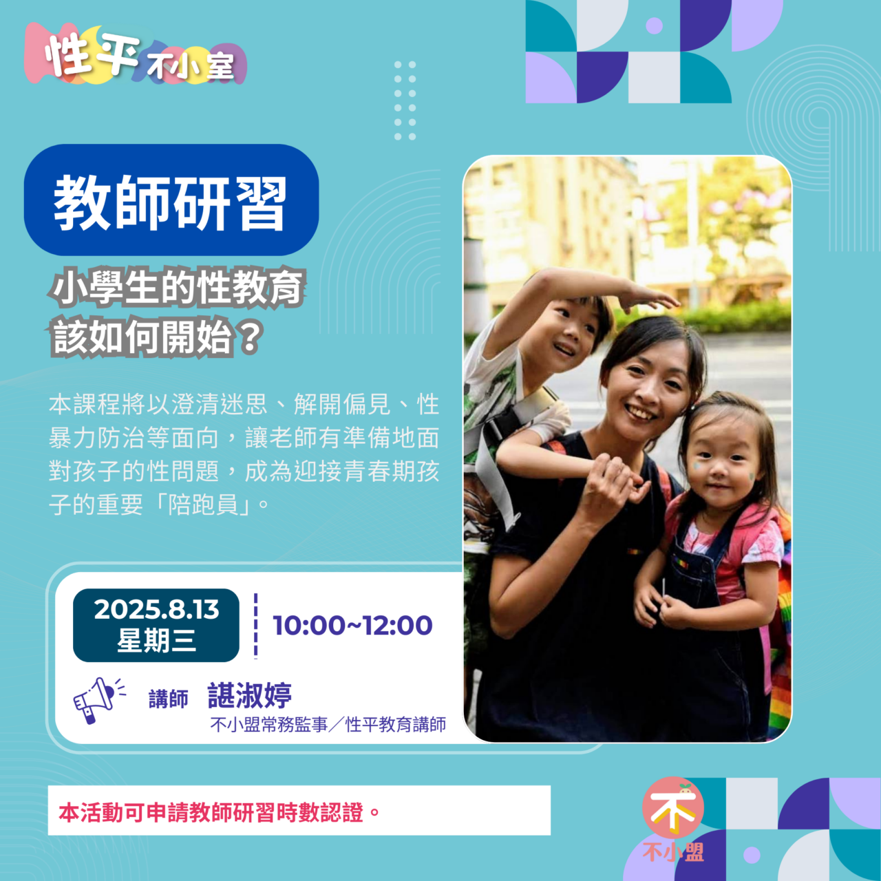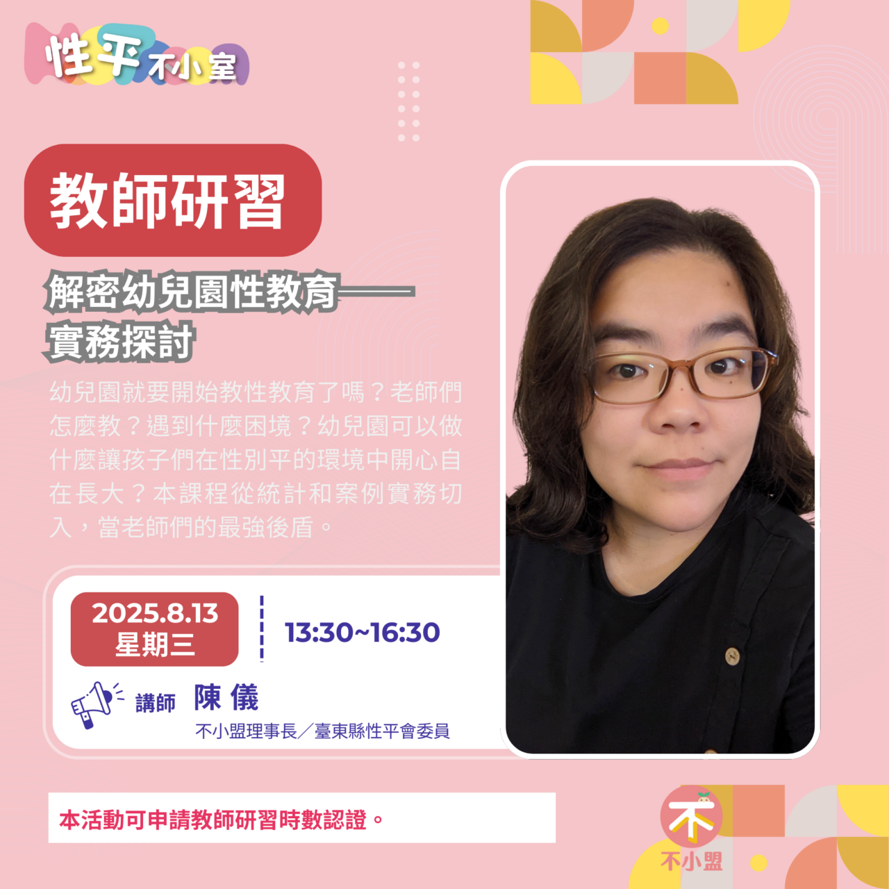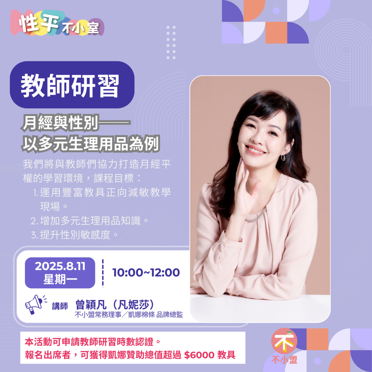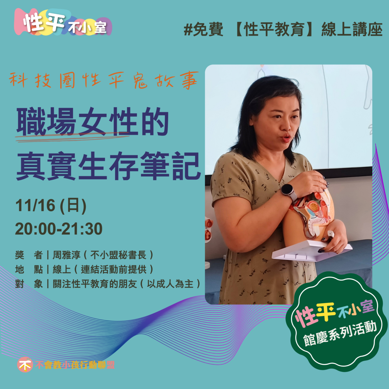 歷史活動 過去沒參與到的,期待未來再相見 教室外的性平課|性別 × 職業 × 素養 一日護理師戲劇工作坊 教室外的性平課|性別 × 職業 × 素養 一日護理師戲劇工作坊 性平不小室2025夏令營 你是超性平行動家!(升2至4年級) 性平不小室2025夏令營 你是超性平行動家!(升2至4年級) 性平不小室2025夏令營 你是性平行動家!(升1至3年級) 性平不小室2025夏令營 你是性平行動家!(升1至3年級) 3-6歲性教育專人導覽【雅淳老師進階版】 遊戲加導覽,有玩又有 3-6歲性教育專人導覽【雅淳老師進階版】 遊戲加導覽,有玩又有 性教育半日工作坊 孩子的性煩惱,我們一起找答案! 性教育半日工作坊 孩子的性煩惱,我們一起找答案! 3-6歲性教育專人導覽【基礎版】 怎麼玩都好玩還有小秘密 3-6歲性教育專人導覽【基礎版】 怎麼玩都好玩還有小秘密 6-9歲性教育專人導覽【基礎版】 怎麼玩都好玩還有小秘密 6-9歲性教育專人導覽【基礎版】 怎麼玩都好玩還有小秘密 5-8歲性平基地導覽──身體界線變變變【基礎版】 只教紅燈不能摸,是對的嗎? 5-8歲性平基地導覽──身體界線變變變【基礎版】 只教紅燈不能摸,是對的嗎? 【雅淳老師】青春期進階課程 親子共學戀愛課 【雅淳老師】青春期進階課程 親子共學戀愛課 親職性平教育講座 開口談性教育,怎麼這麼難? 親職性平教育講座 開口談性教育,怎麼這麼難? 你是性平行動家!(1至3年級) 你是性平行動家!(1至3年級) 你是性平行動家!(4至6年級) 你是性平行動家!(4至6年級) 性平不小室教師研習課 「旁觀」他人的痛苦:性侵害防治教育怎麼教? 性平不小室教師研習課 「旁觀」他人的痛苦:性侵害防治教育怎麼教? 性平不小室教師研習課 解密幼兒園性教育──實務探討 性平不小室教師研習課 解密幼兒園性教育──實務探討 性平不小室教師研習課 月經與性別──以多元生理用品為例 性平不小室教師研習課 月經與性別──以多元生理用品為例 性平不小室教師研習課 小學生的性教育,該如何開始? 性平不小室教師研習課 小學生的性教育,該如何開始? 當網路成為兒少性剝削場域 相關法規及案例 當網路成為兒少性剝削場域 相關法規及案例 紀錄片巡迴放映 少年報導者《人生的縫隙》 紀錄片巡迴放映 少年報導者《人生的縫隙》 彩虹聖誕之旅 性平基地導覽+奇幻創意手作 彩虹聖誕之旅 性平基地導覽+奇幻創意手作 不小盟冬令營 低年級場:我的身體我做主 不小盟冬令營 低年級場:我的身體我做主 不小盟冬令營 中年級場:青春期超前部署 不小盟冬令營 中年級場:青春期超前部署 不小盟冬令營 高年級場:這是我的青春期 不小盟冬令營 高年級場:這是我的青春期 【性別×科學|工作坊】想像力大爆炸 STEAM任務解鎖中 破框思考,科學創造不設限 【性別×科學|工作坊】想像力大爆炸 STEAM任務解鎖中 破框思考,科學創造不設限 不小憩時光 每周三下午(成人場次、親子場次) 不小憩時光 每周三下午(成人場次、親子場次) 新興糊紙文化 性教育主題蓪草包 新興糊紙文化 性教育主題蓪草包 親子烘焙課 手作花見糰子享受室內野餐 親子烘焙課 手作花見糰子享受室內野餐 艾力黑板畫 紓壓手作,帶回美麗作品 艾力黑板畫 紓壓手作,帶回美麗作品 性平不小室教師研習課 解密幼兒園性教育-實務探討 性平不小室教師研習課 解密幼兒園性教育-實務探討 性平不小室教師研習課 國中性教育教案與實務分享:課程、團體與個別諮商 性平不小室教師研習課 國中性教育教案與實務分享:課程、團體與個別諮商 性平不小室教師研習課 月經與性別─以多元生理用品為例 性平不小室教師研習課 月經與性別─以多元生理用品為例 性平不小室教師研習課 小學生的性教育該從何開始? 性平不小室教師研習課 小學生的性教育該從何開始? 繪本說性平故事 繪本說性平故事 公廁還能更性別友善嗎? 廁所「性別友善」2.0 公廁還能更性別友善嗎? 廁所「性別友善」2.0 〈運動場上的女性:身體、界線與勇氣〉座談會 專屬女性運動員的實用工具書 〈運動場上的女性:身體、界線與勇氣〉座談會 專屬女性運動員的實用工具書 |館慶系列|烏烏醫師「無框女子的日常:更年期可以這麼過」 性平不小室|館慶系列活動| |館慶系列|烏烏醫師「無框女子的日常:更年期可以這麼過」 性平不小室|館慶系列活動| |館慶系列|科技圈性平鬼故事 職場女性的真實生存筆記 性平不小室|館慶系列活動| |館慶系列|科技圈性平鬼故事 職場女性的真實生存筆記 性平不小室|館慶系列活動| 避難時期的生理期大解析 非常時期:每個人都該懂的身體照護 避難時期的生理期大解析 非常時期:每個人都該懂的身體照護 《黑糖的女兒》創作故事分享 《黑糖的女兒》創作故事分享 樂高得寶救援小英雄 幼兒潛能大挑戰 樂高得寶救援小英雄 幼兒潛能大挑戰 神奇海獅:鬼的進化史 神奇海獅:鬼的進化史