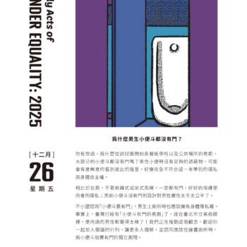近年台灣推動性別平等,有許多很棒的成果,性別友善廁所應該可以算是與我們日常生活最息息相關的其中一項,但你想過性別友善廁所到底是友善誰嗎?它真的能滿足多元性別、不同族群的使用需求嗎?它真的沒有問題嗎?