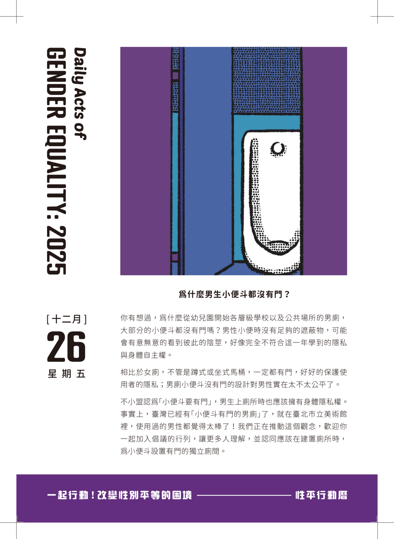 今年2026臺灣同志遊行前夕,不小盟將舉辦「公廁還能更性別友善嗎?」講座,邀請關注性別平等的朋友們,一起來聊聊不同性別者使用公廁的心聲。我們希望集結多元的使用經驗與真實困境,轉化成公廁更加性別友善的能量與倡議,讓公共空間中的每個人,都能自在、安心地上廁所。