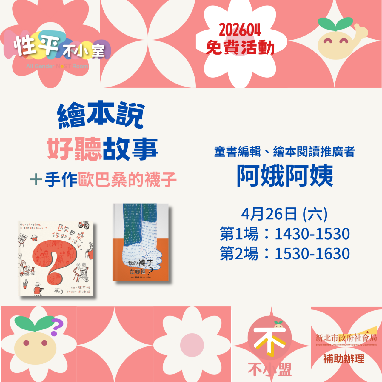 【2026年4月免費活動】繪本說好聽故事《歐巴桑,你欲去佗位?》、《我的襪子在哪裡?》(4/26下午共2場次)