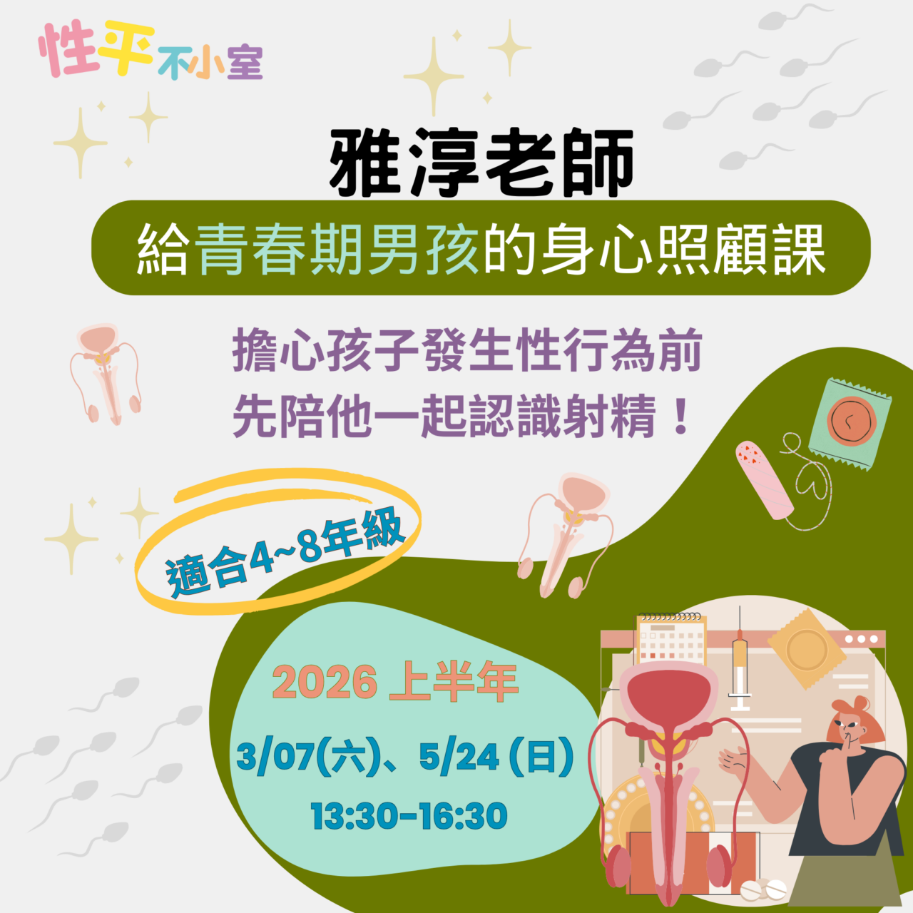 ✅生殖系統(男女都有,以男性為主)介紹;月經、射精及受孕原理;使用人體模型教具及科學模擬影片。