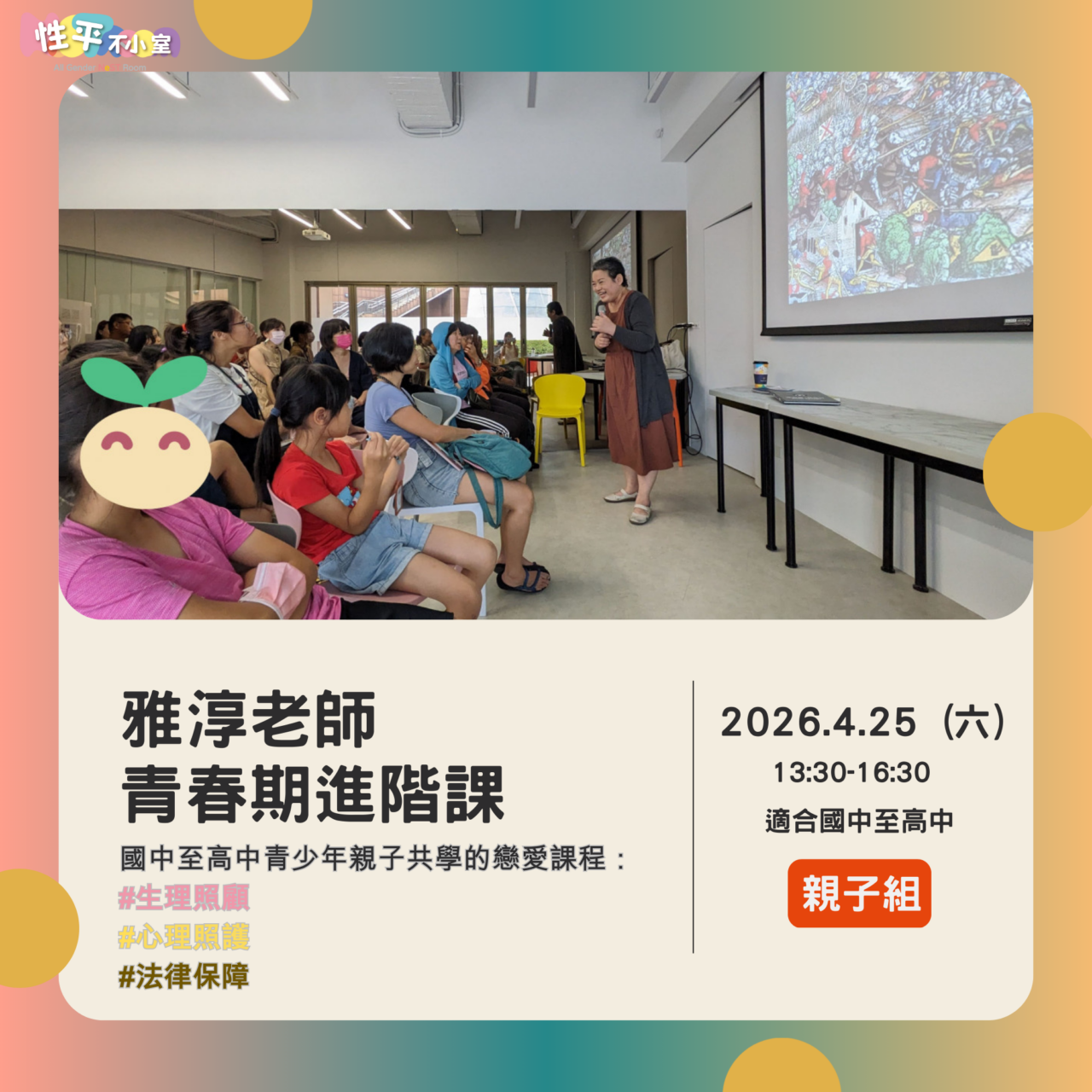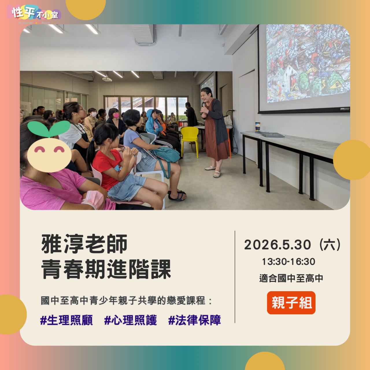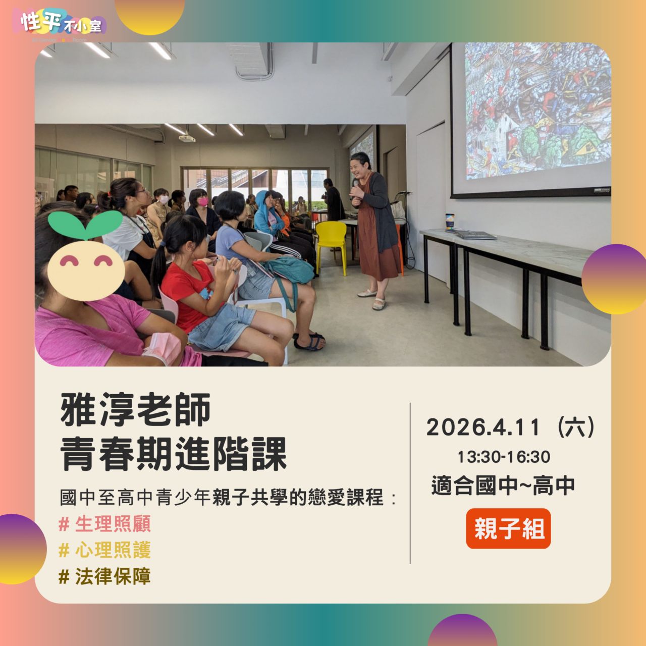 我們的青春期照顧課程,讓男孩女孩學會青春期身心變化及自我照顧基本方法,現在我們想要更進一步,陪著既羞澀又期待的青少年,以及既開心又擔心的家長們,搭起彼此瞭解的溝通橋樑;並且更深入瞭解如避孕、人工流產、性病等重要的生理知識。