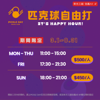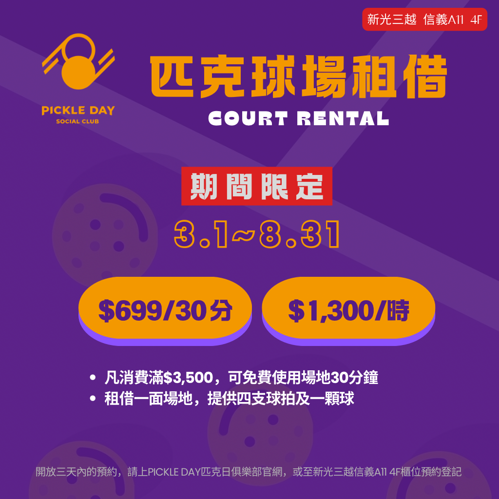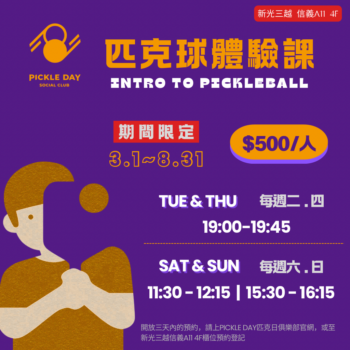- 凡於匹克日俱樂部A11櫃位消費滿$3,500者,可免費使用場地體驗30分鐘,需於櫃檯登記安排,並於報到時出示消費明細及發票,免費體驗恕不另外提供球拍和球