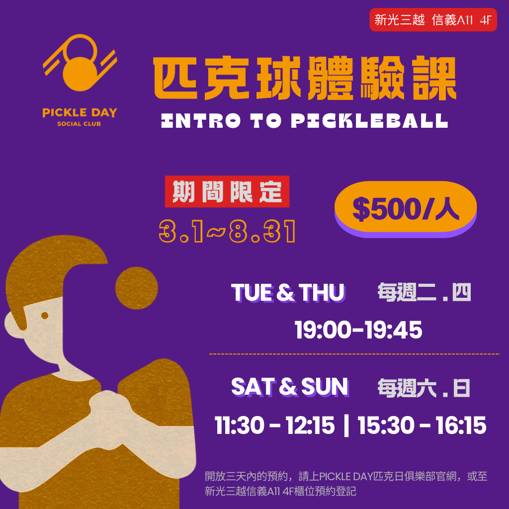 - 需事先於網站或現場櫃位報名,並於上課時段前 15 分鐘至 4F 手扶梯旁「PICKLE DAY SOCIAL CLUB 匹克日俱樂部」快閃櫃位報到繳費。