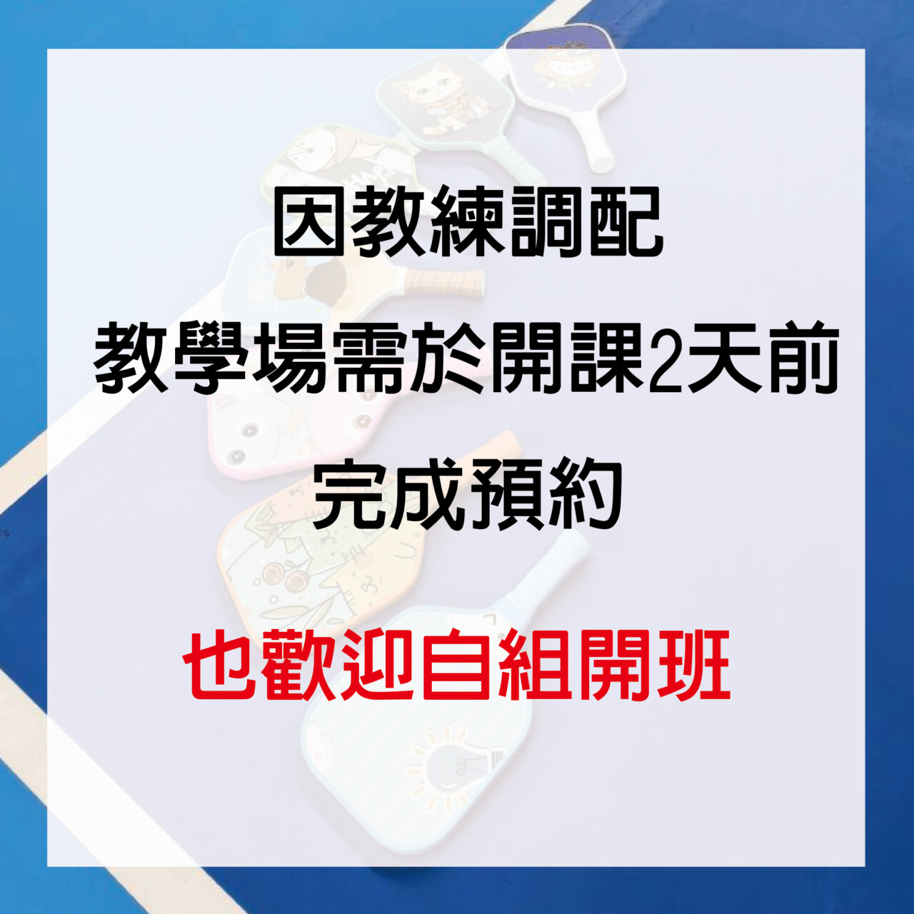 因教練調配教學場需於開課2天前完成預約