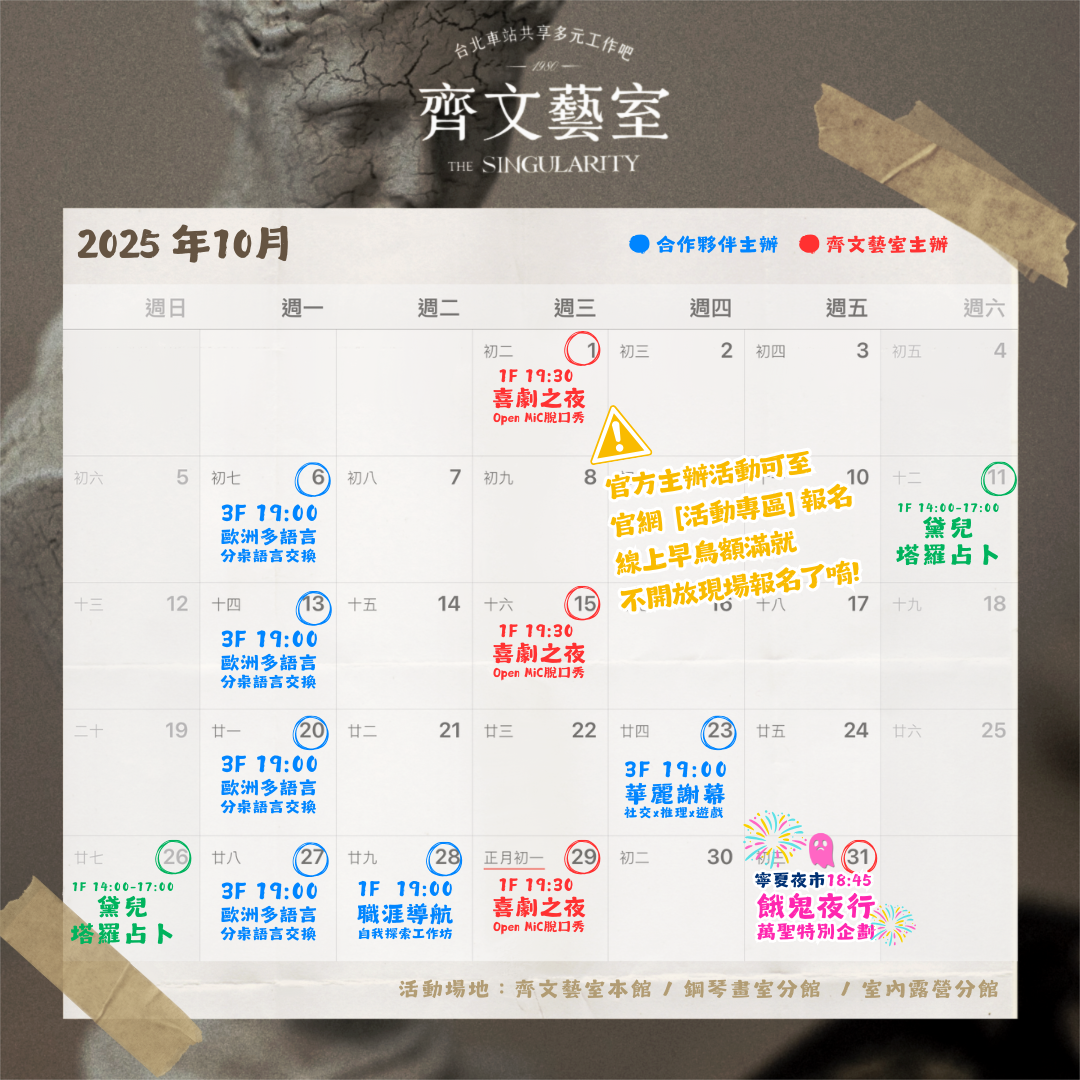 10/01【歐噴麥Open Mic】脫口秀喜劇之夜 NT$300 已售完 10/15【歐噴麥Open Mic】脫口秀喜劇之夜 NT$300 已售完 10/16(四)【法文電影夜French Movie Night】看電影練習法文 (複製) NT$200 已售完 10/28(二)【自我探索工作坊】從標籤,找到專屬自己的答案 NT$650 已售完 10/29【歐噴麥Open Mic】脫口秀喜劇之夜 NT$300 加入購物車 10/31萬聖節別企劃【餓鬼夜行】 NT$1,299 已售完 11/15【書蟲派對】台北場──簡言之,大家帶各自喜歡的書,在同一個空間,一起看書。 NT$0 加入購物車 特價 11/28(五)社交x推理x遊戲【華麗謝幕–精準失誤的魔術】 NT$850 NT$700 現省:NT$150 加入購物車 Every Monday19:00【Language Exchange】English, French, Spanish, German and Chinese NT$0 加入購物車 每週一~五【✨齊異點Social Club✨】晚間活動開跑啦! NT$0 加入購物車