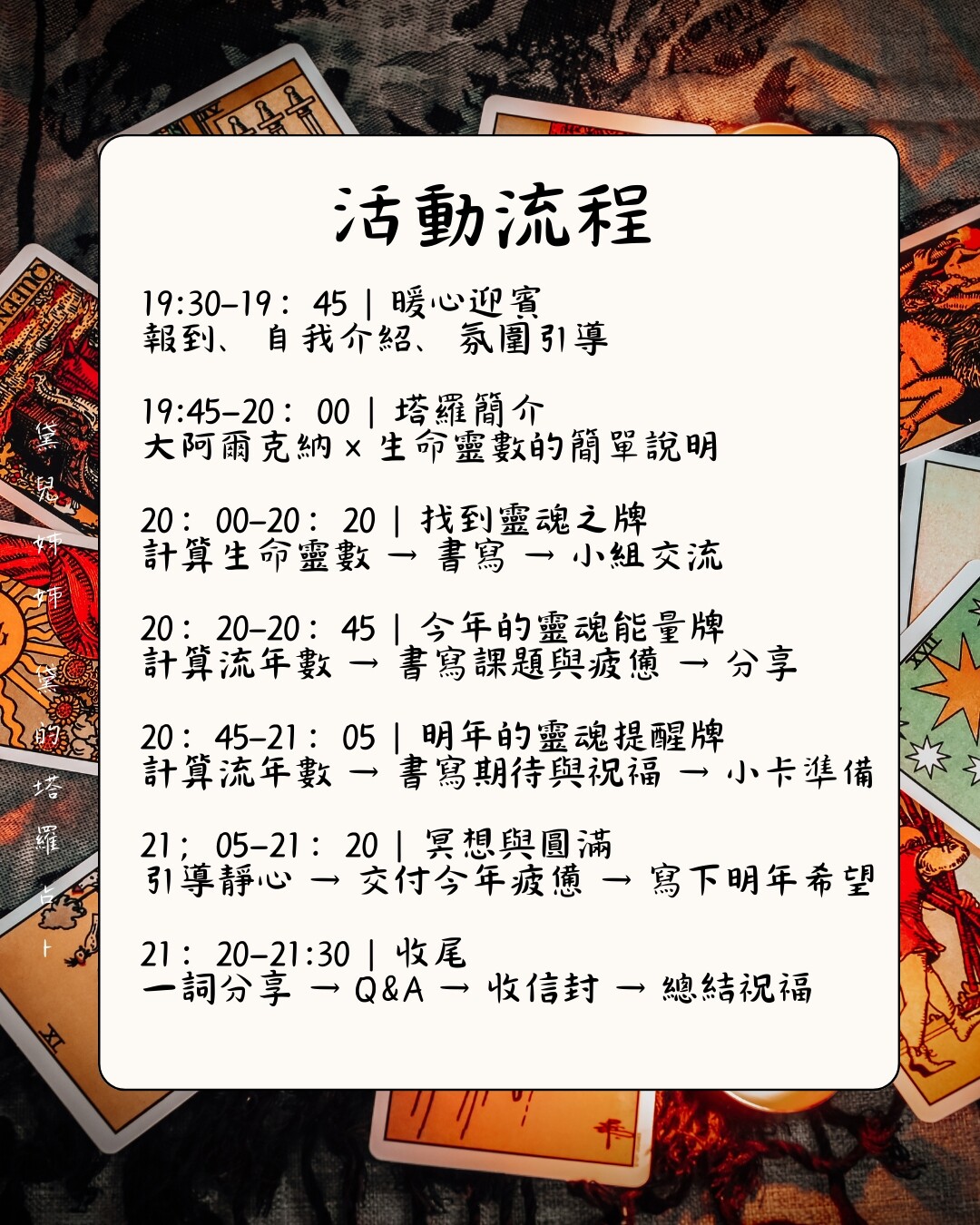 在活動中,我將帶你透過生命靈數的計算,找到屬於你的大阿爾克納牌, 並且學習流年的計算方式與對照的大阿爾克納牌,讓你不僅每一年都可以透過大阿爾克納牌,回顧過去的同時展望未來,還可以幫助他人了解自己的塔羅密碼。