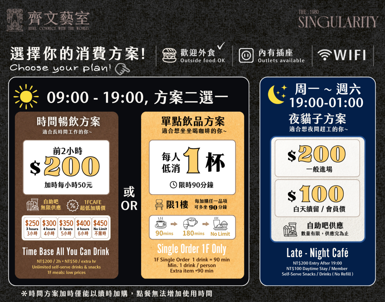 1F-C 咖啡廳座位 低消1杯飲品,90分鐘 立即預約 2F-H 交誼廳高腳座位 前2hr 200元,+50元/hr,上限450元!會員有優惠! 立即預約 2F-L 交誼廳升降桌座位 前2hr 200元,+50元/hr,上限450元!會員有優惠! 立即預約 2F-P 交誼廳面牆個人位 前2hr 200元,+50元/hr,上限450元!會員有優惠! 立即預約 2F-Q 專注區大桌座位 前2hr 200元,+50元/hr,上限450元!會員有優惠! 立即預約 2F-W 專注區面窗座位 前2hr 200元,+50元/hr,上限450元!會員有優惠! 立即預約 夜貓子方案 入場200即可待到1:00,白日續購or會員100 立即預約