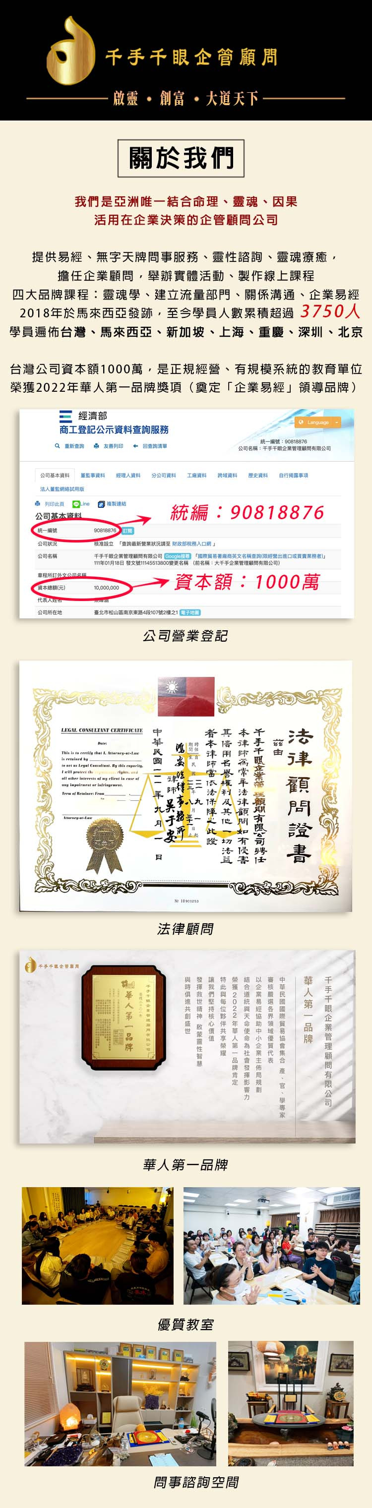 我們理解目前網路詐騙很多,所以有這樣的顧慮擔心是正常的,你可以到台灣經濟部商業司網站(google搜尋關鍵字「經濟部商業司」或到以下網站 https://findbiz.nat.gov.tw/fts/query/QueryBar/queryInit.do)查詢我們的公司,公司登記名字為「千手千眼企業管理顧問有限公司」,統編為90818876,資本額為1000萬台幣,是正規經營的公司。