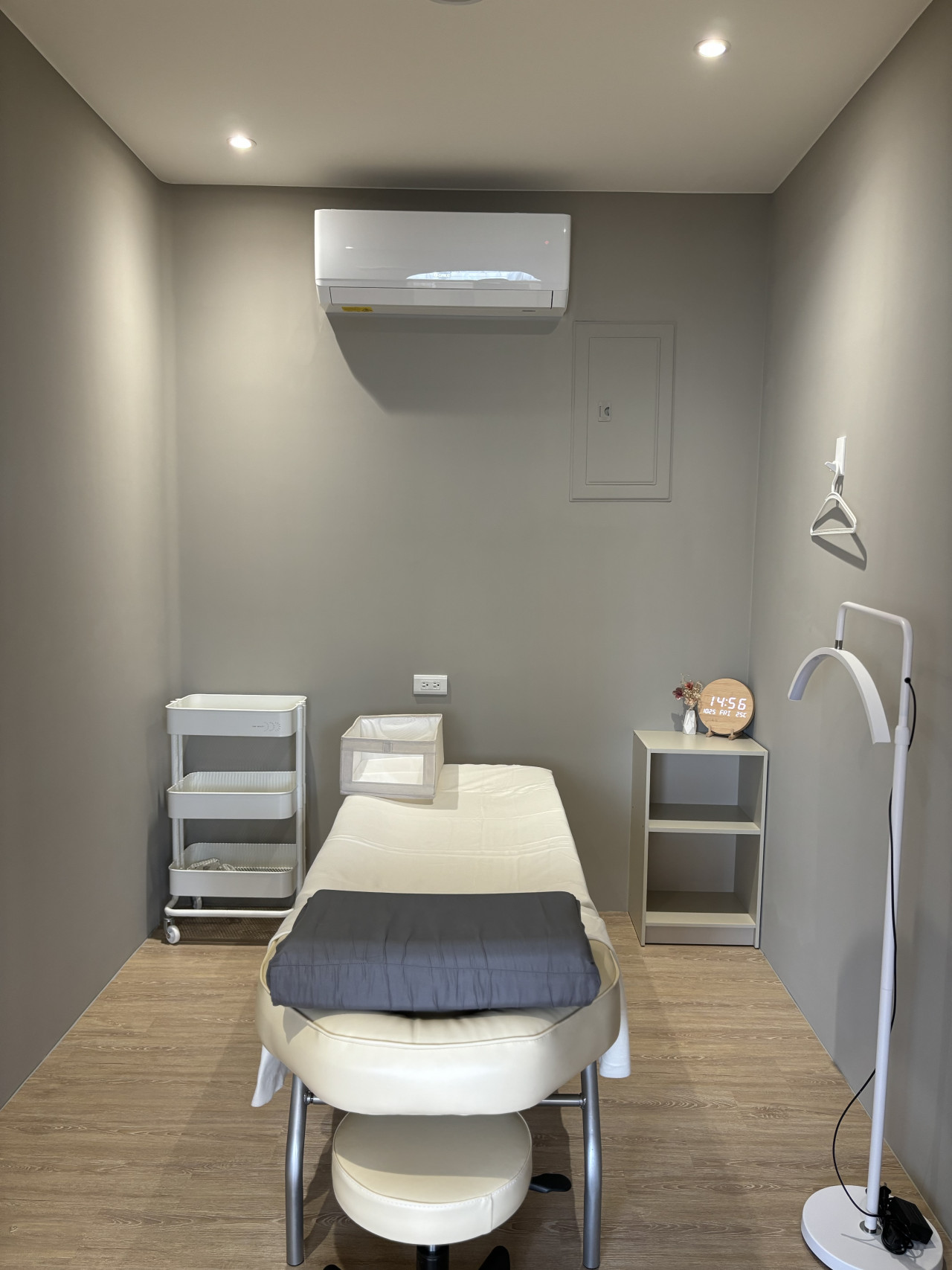 【房內設備清單】 內嵌掛鏡、美容床椅、美容燈、置物鎖櫃、掛衣架、消毒酒精、延長線。