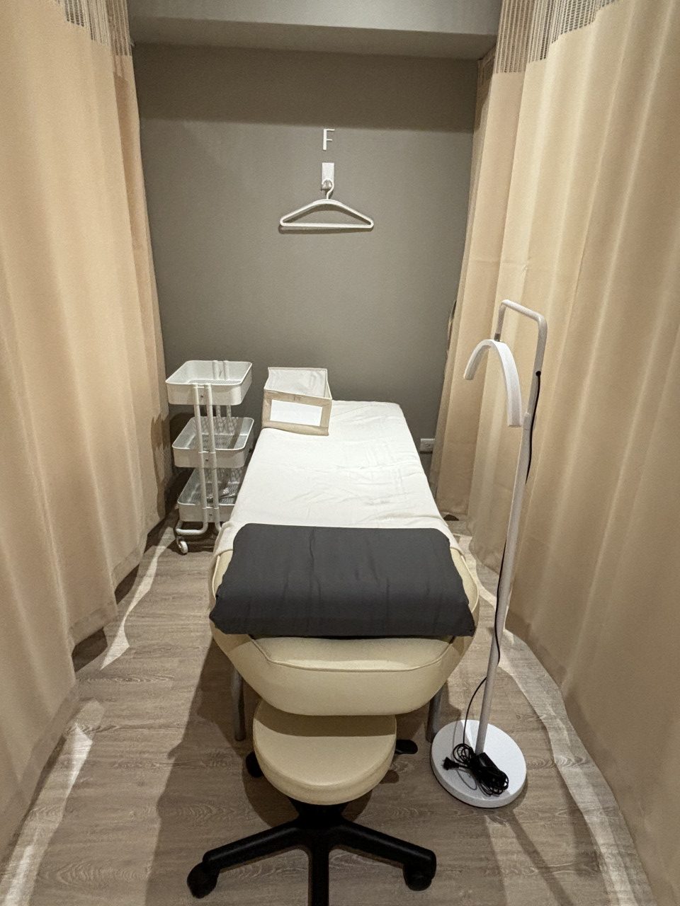 【房內設備清單】 美容床椅、拉鏈隔簾、基本照明、置物籃、延長線。