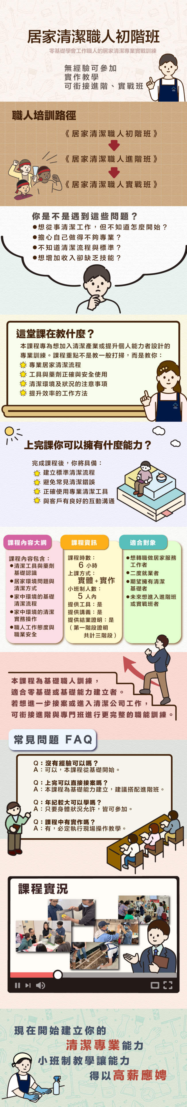 專職在職講師實際操演及實作帶領, 掌握居家清潔的秘辛! ● 講求實際操作、經驗學習 ● 基礎概念打好底,實際上工不碰壁 ● 實用教案,讓你快速上手 ● 重點清潔邏輯,讓你上工不怕環境變化 ● 全課程學成等於擁有業界三個月能力值