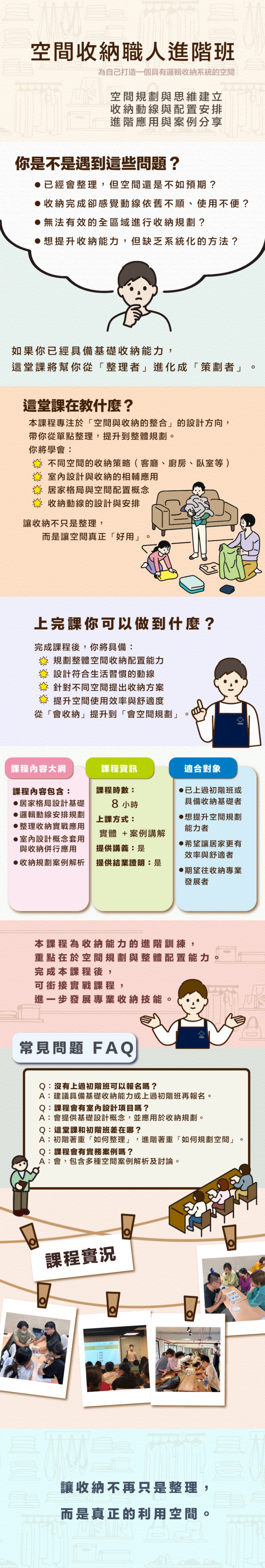 用室內設計的方式設計的收納技巧課程, 為您的收納更進一步的提升 ● 中式環境搭配日式技巧,相輔相成 ● 空間規劃與收納思維建立 ● 收納動線的設計方式 ● 案例分享,讓收納淺顯易懂